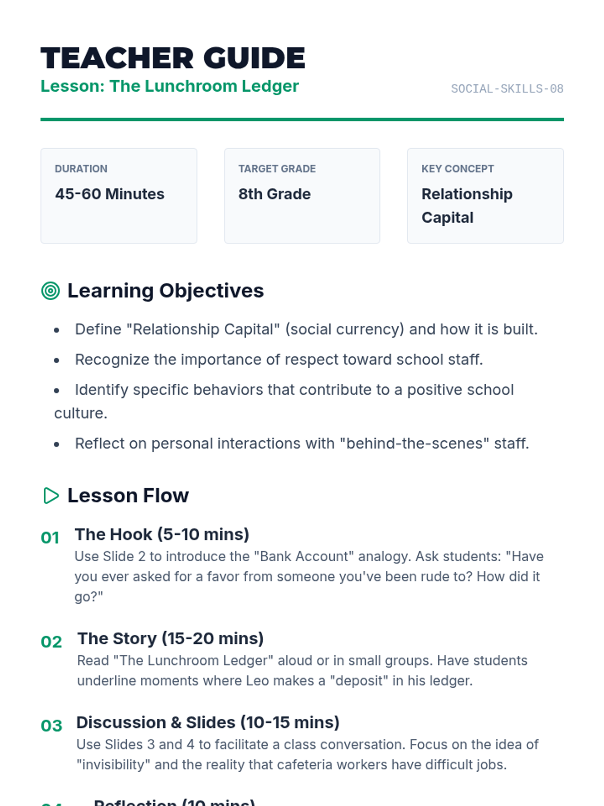 A comprehensive teacher's guide for the 'Lunchroom Ledger' lesson, including learning objectives, a structured lesson flow, and discussion prompts to facilitate social-emotional learning.