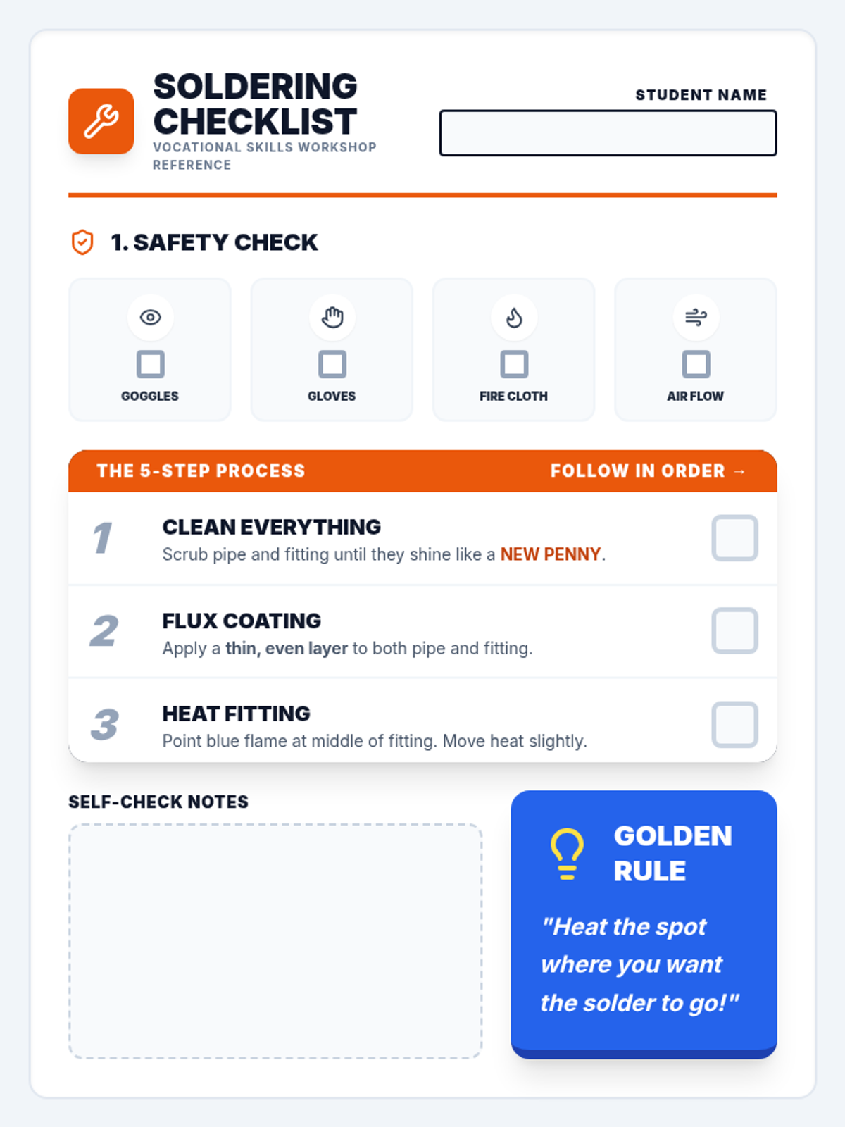 A student-facing checklist and visual guide for copper soldering. Includes a safety equipment checklist, a numbered 5-step process summary, and a space for inspection notes.