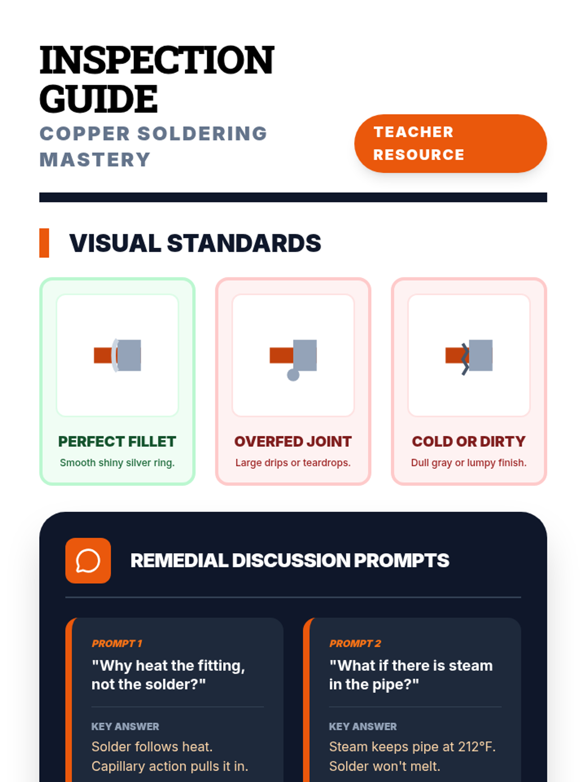 A teacher-facing resource for assessing student soldering work. Includes inspection criteria for perfect vs. failed joints, discussion prompts for remedial learners, and technical troubleshooting tips.