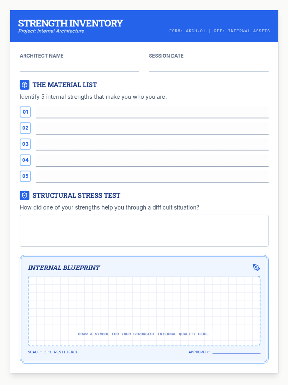 A revised reflective student worksheet themed as an architectural blueprint, now optimized for legibility with a light drawing area and improved page fitting.