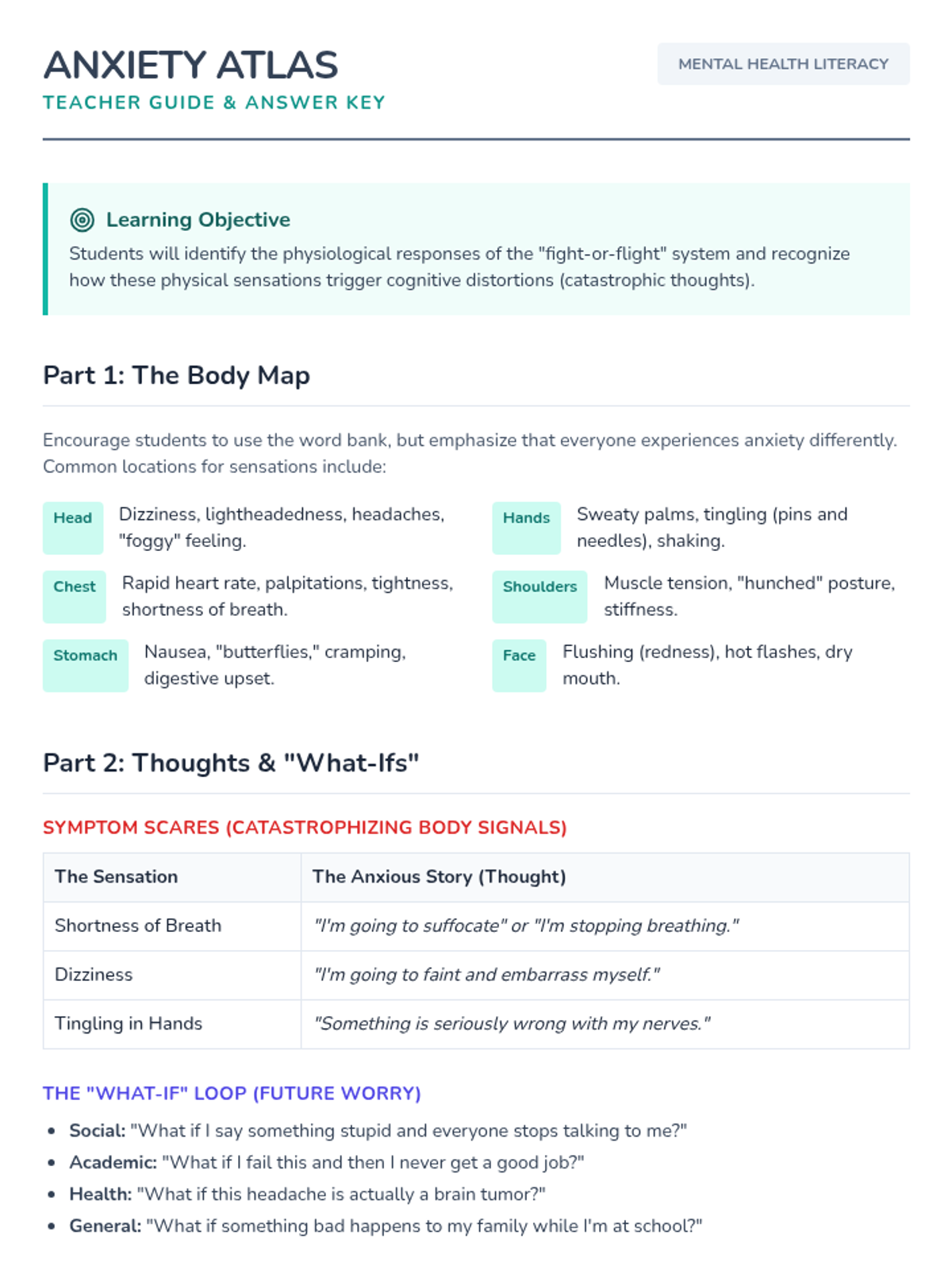 A teacher's companion guide for the Anxiety Atlas lesson, providing common examples of physiological sensations, cognitive distortions, and discussion prompts for classroom use.
