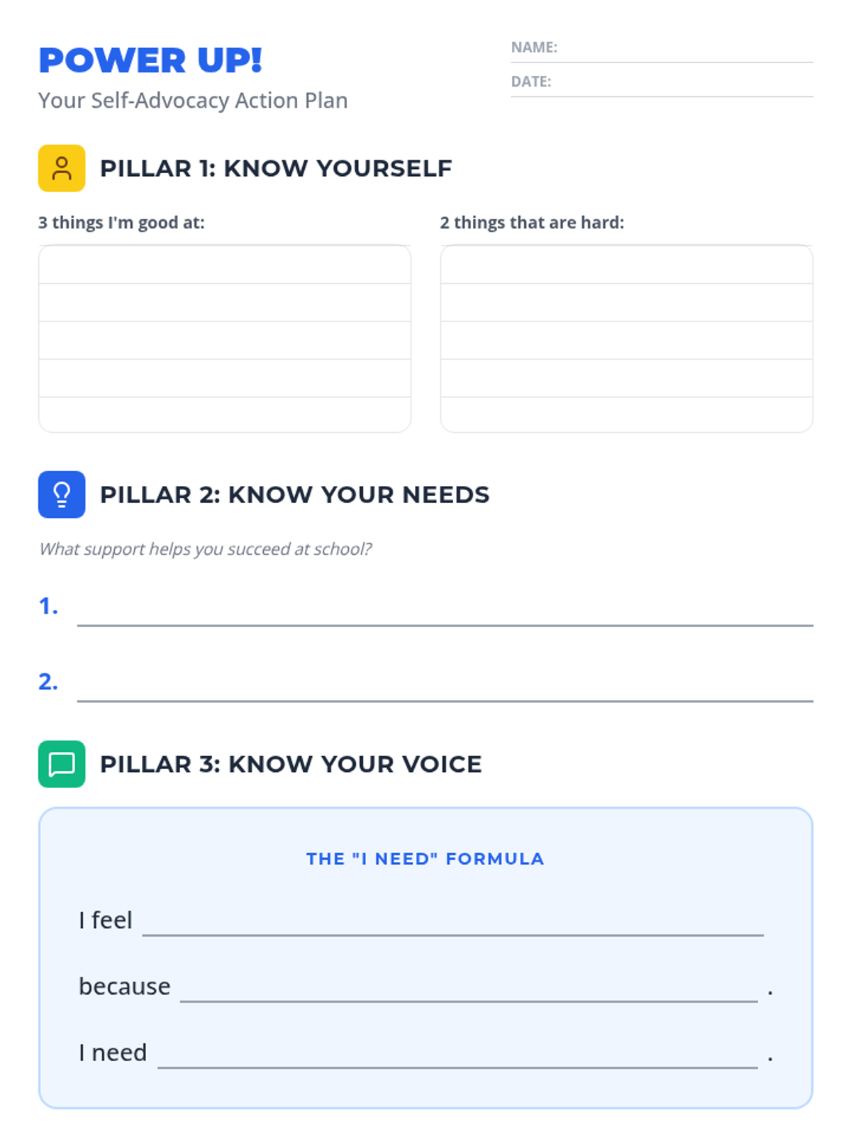 An interactive student worksheet designed to build self-advocacy skills through self-reflection and practical scenario-based exercises using a structured communication formula.