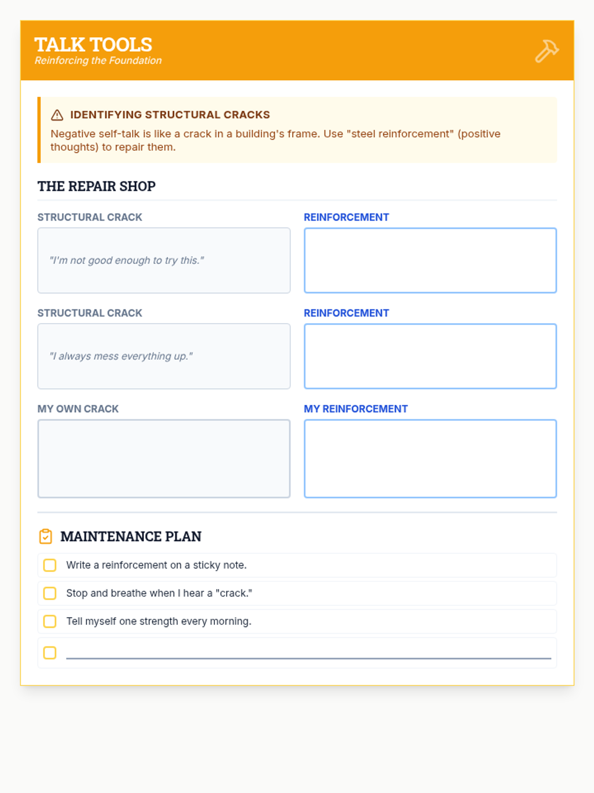A revised student activity worksheet for positive self-talk, now featuring significantly larger writing areas and improved layout to ensure all content fits on a single page.