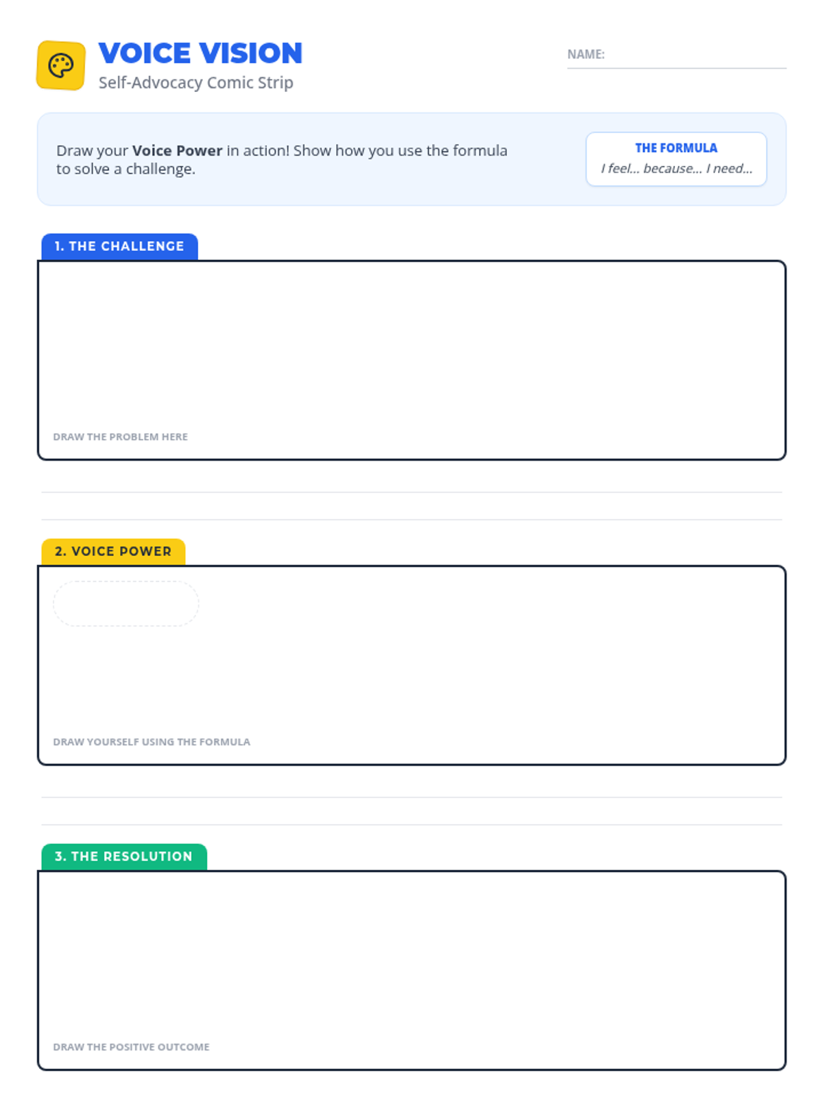 A creative drawing activity where students illustrate a self-advocacy scenario using a three-panel comic strip format to practice assertive communication visually.