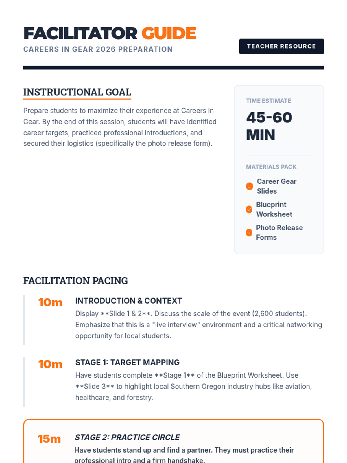 A comprehensive instructional guide for teachers to lead the Careers in Gear 2026 preparation session. Includes a timed pacing guide, active learning exercises for handshakes/introductions, and discussion prompts.