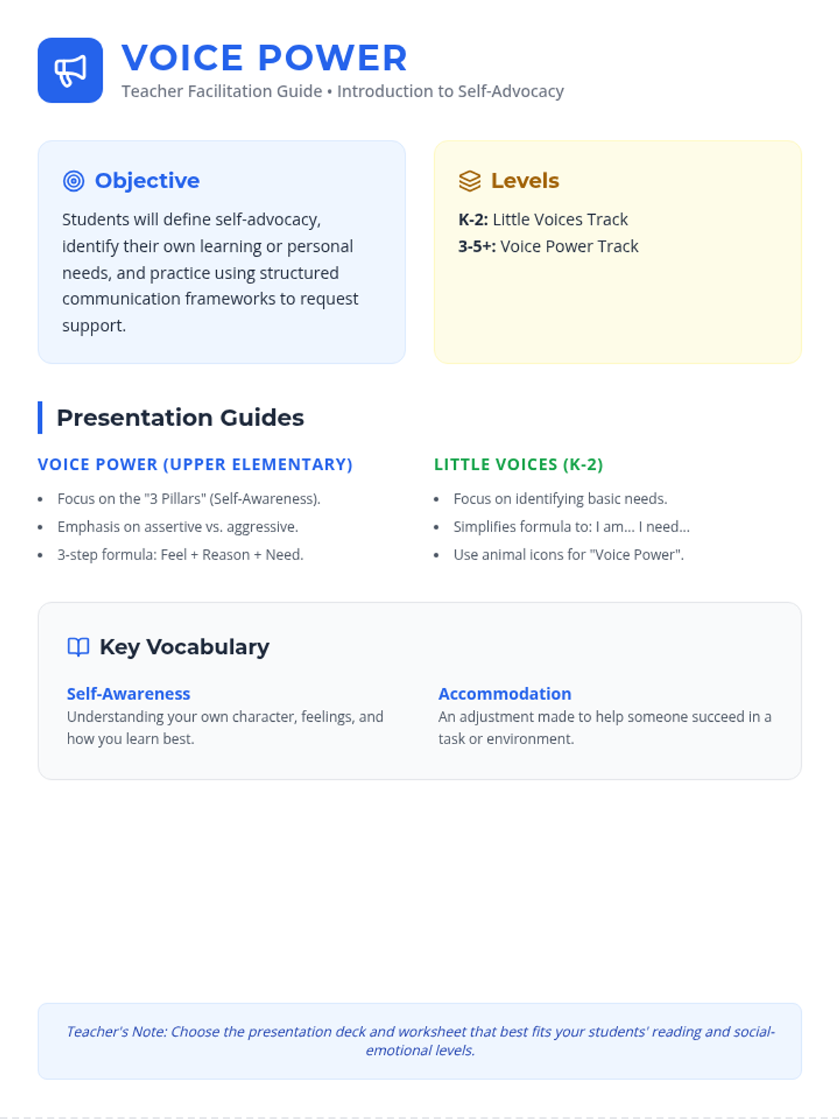 A comprehensive teacher's guide for introducing self-advocacy, featuring lesson objectives, discussion prompts, vocabulary, and an answer key for practice scenarios.