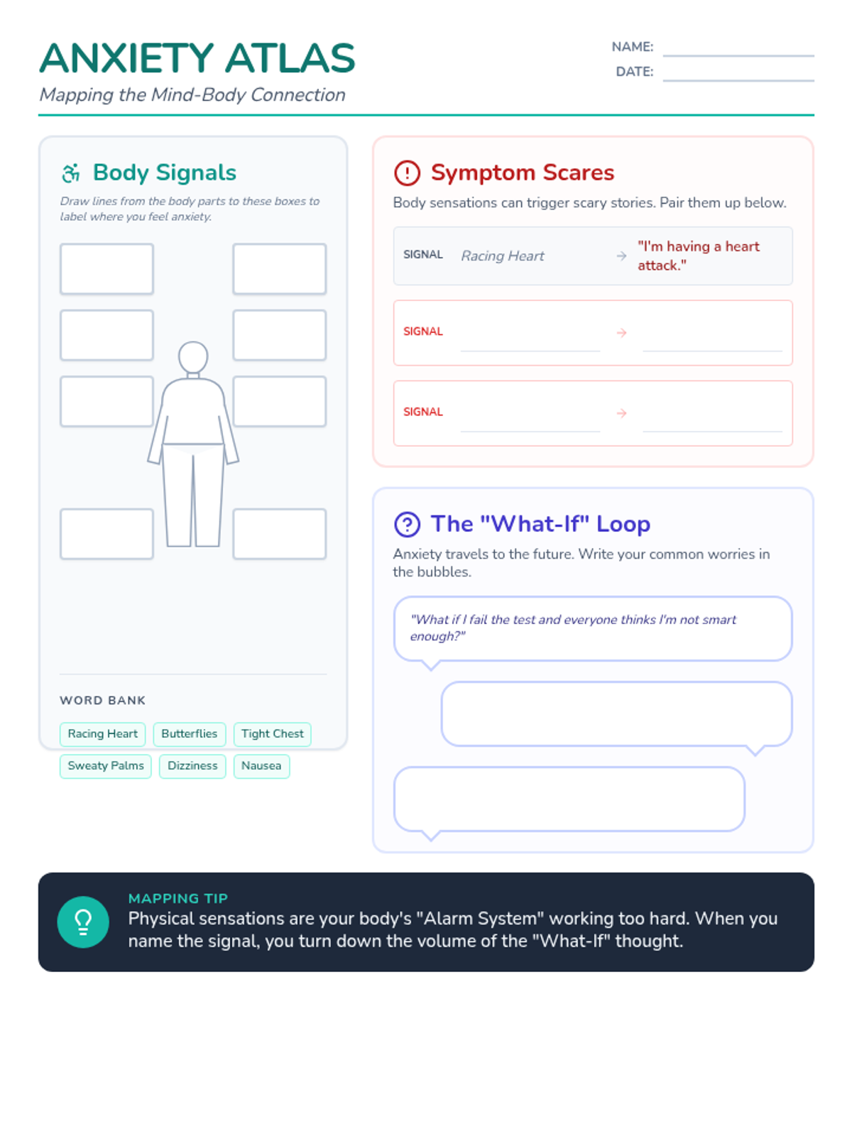An interactive worksheet featuring a body map for labeling anxiety's physical sensations and sections for documenting catastrophic 'What-If' thoughts and symptom-focused worries.