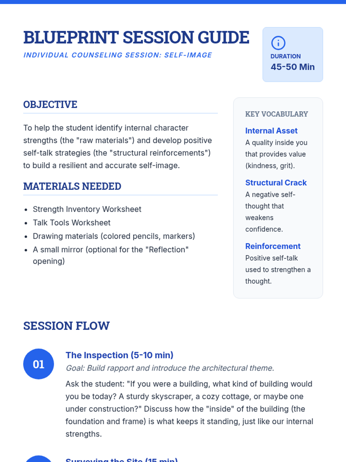 A comprehensive teacher-facing session guide for an individual counseling session focused on self-image, using an architectural 'Inner Architect' theme.