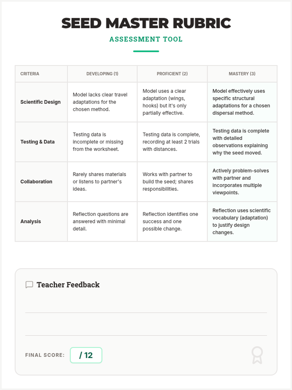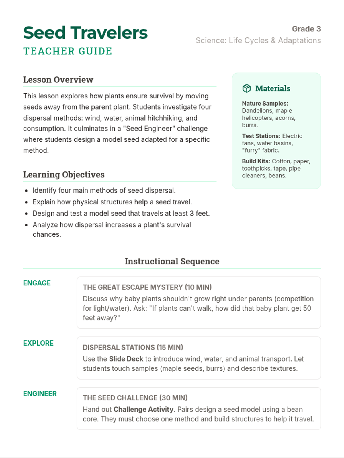 A comprehensive teacher guide for the Seed Travelers lesson, including learning objectives, a detailed instructional sequence (Engage, Explore, Engineer, Evaluate), differentiation strategies, and common student misconceptions.