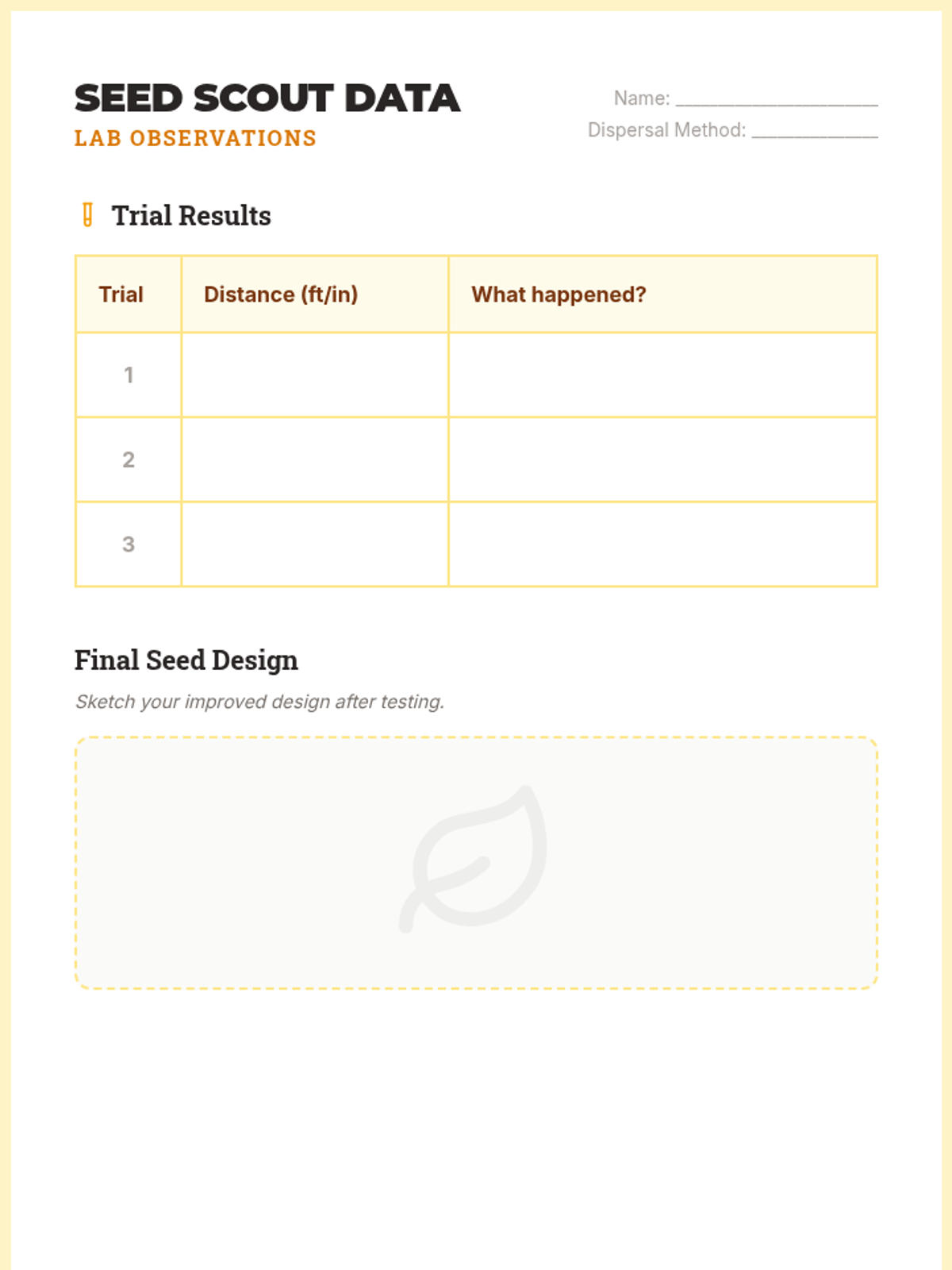 A data collection worksheet for students to record their trial results (distance and observations), reflect on their engineering design through written analysis, and sketch their final seed model.