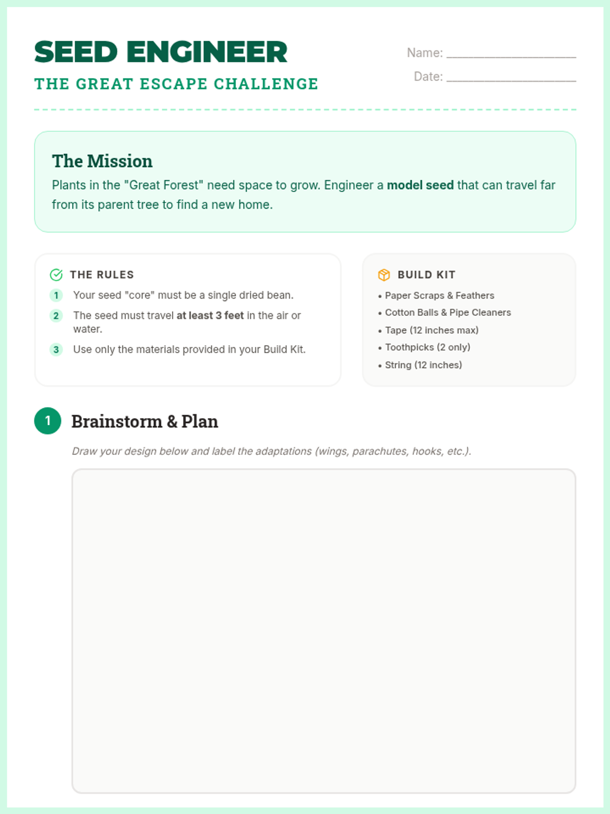 A student-facing engineering challenge sheet that outlines the mission, rules, and materials for designing a model seed, including a large designated workspace for students to sketch and label their design plans.