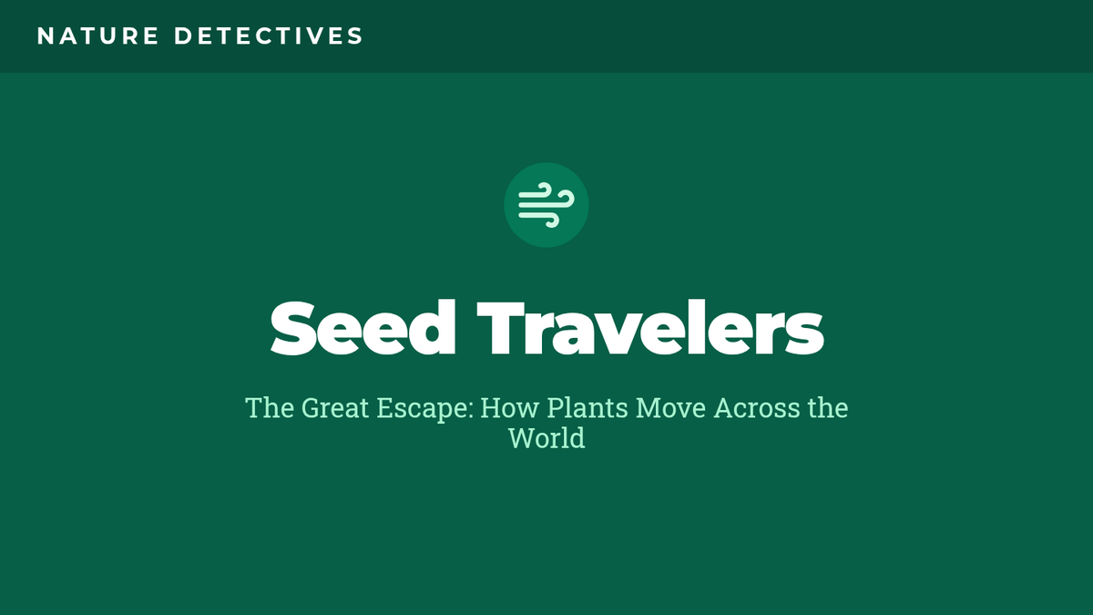 A visually engaging slide deck with 7 slides covering the importance of seed dispersal, methods of travel (wind, water, animal hitchhiking, and animal delivery), and the final engineering challenge prompt.