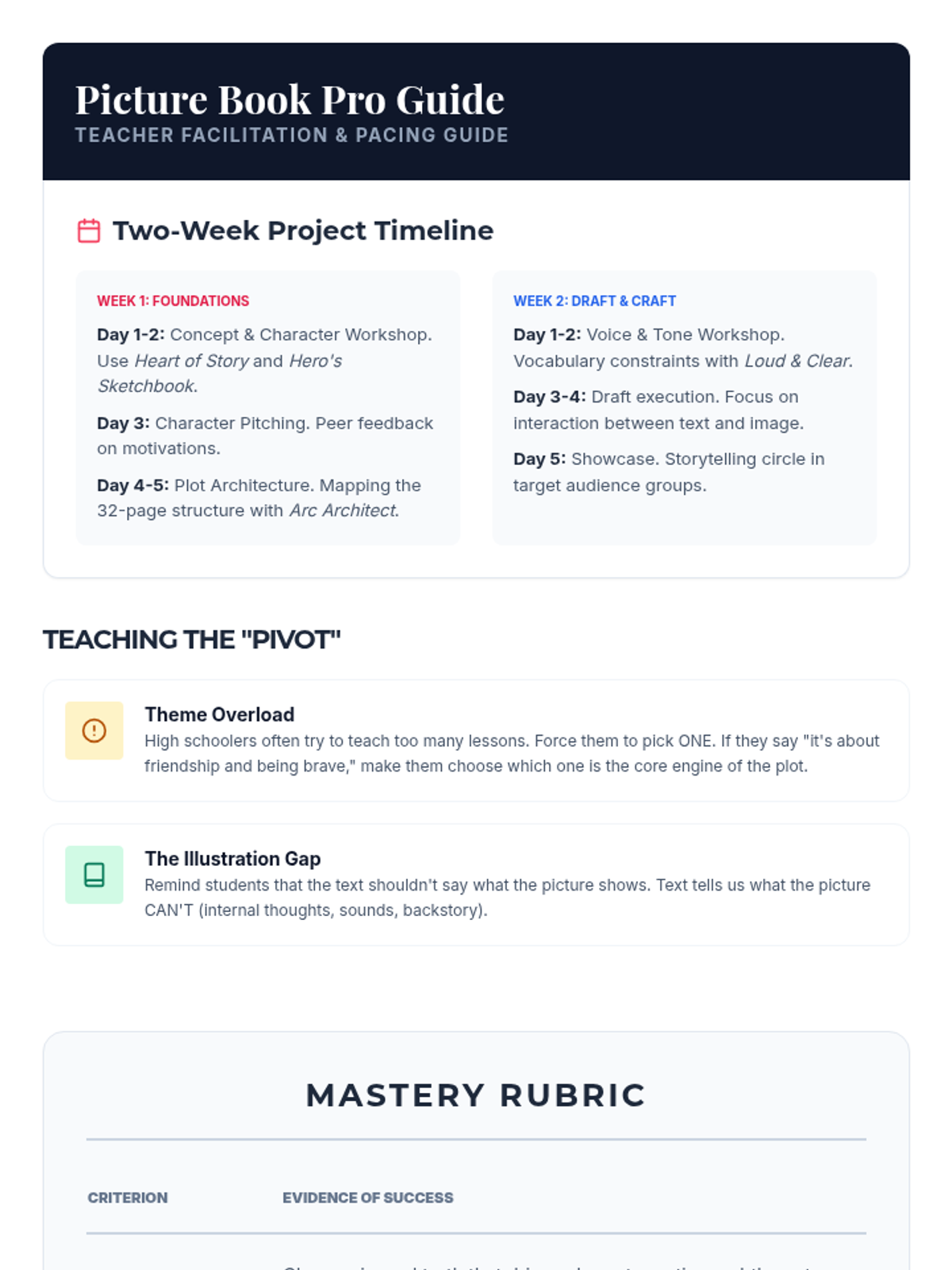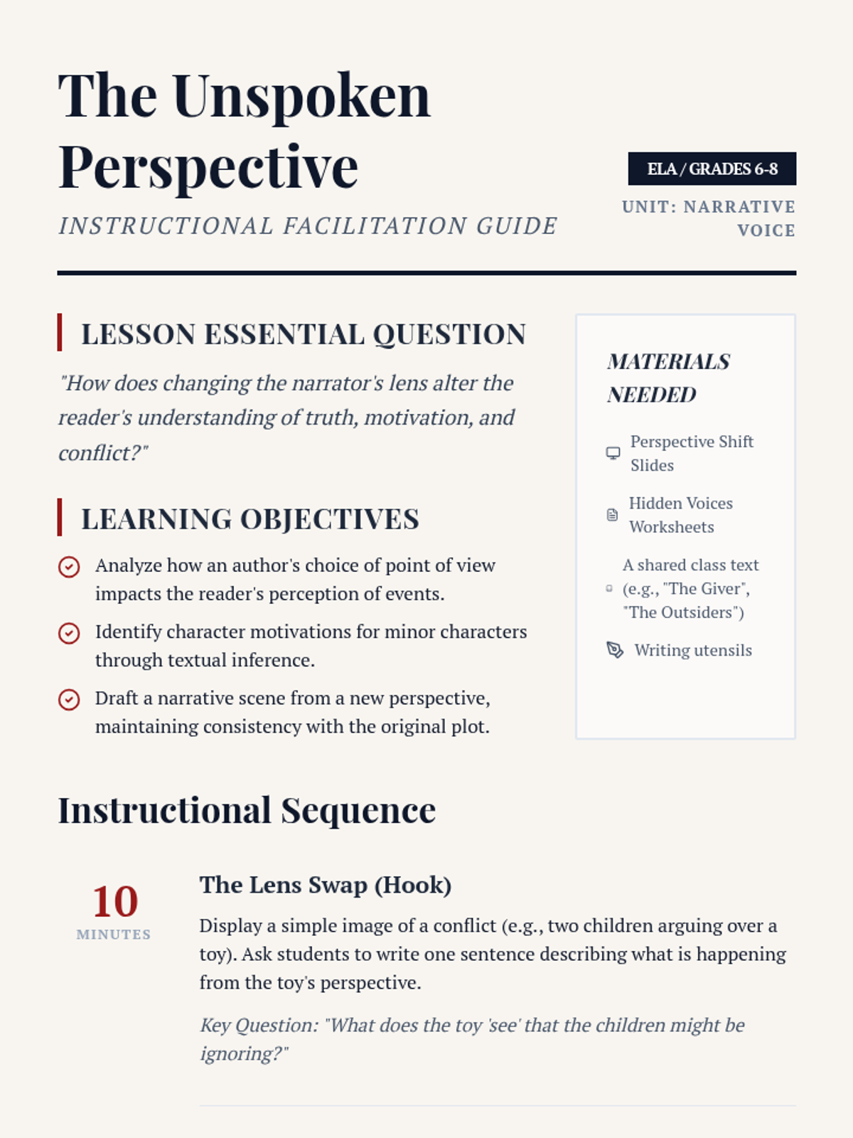 A comprehensive facilitation guide for teachers including lesson objectives, timing, instructional sequence, differentiation strategies, and an assessment rubric for the POV rewrite activity.