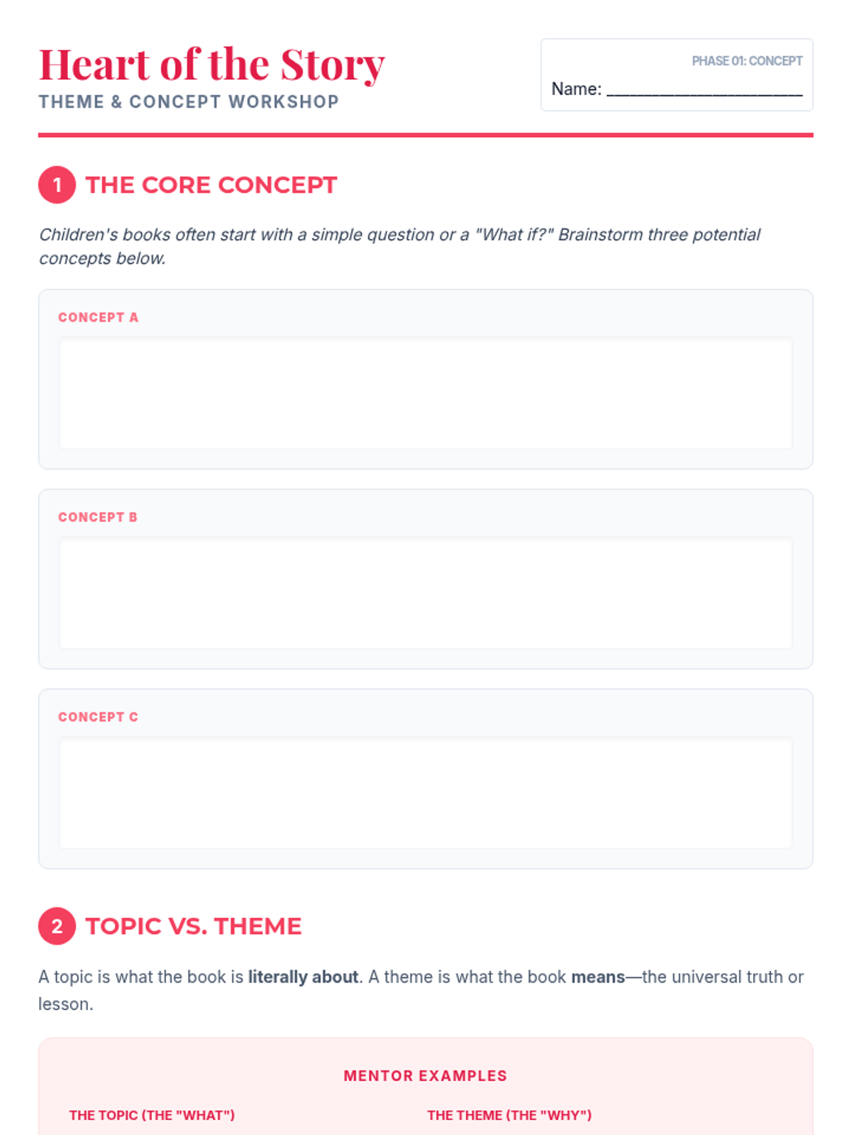 Revised workshop worksheet for theme development, now featuring mentor examples to help students distinguish between literal topics and universal themes. Improved page breaks and student work area sizing.