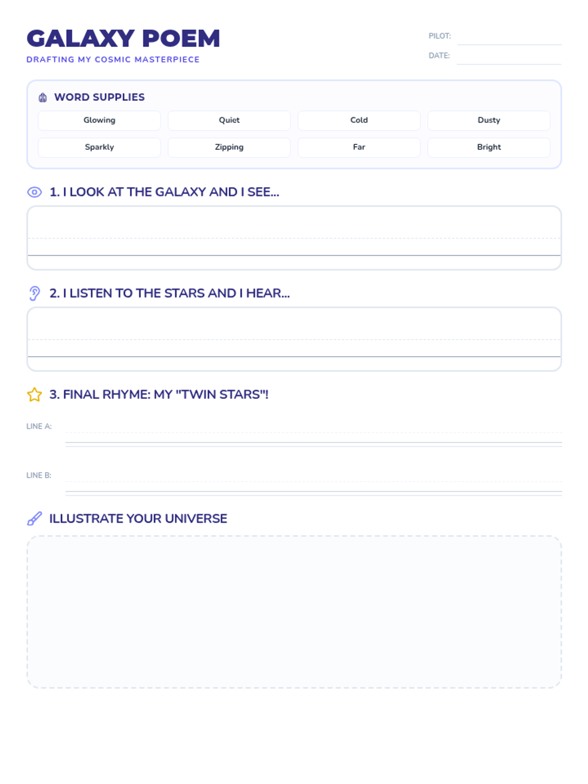 A guided writing worksheet for 1st graders to draft their own 'Galaxy Poem'. It includes a sensory word bank, fill-in-the-blank prompts for sight and sound, and a space for a rhyming couplet and illustration.