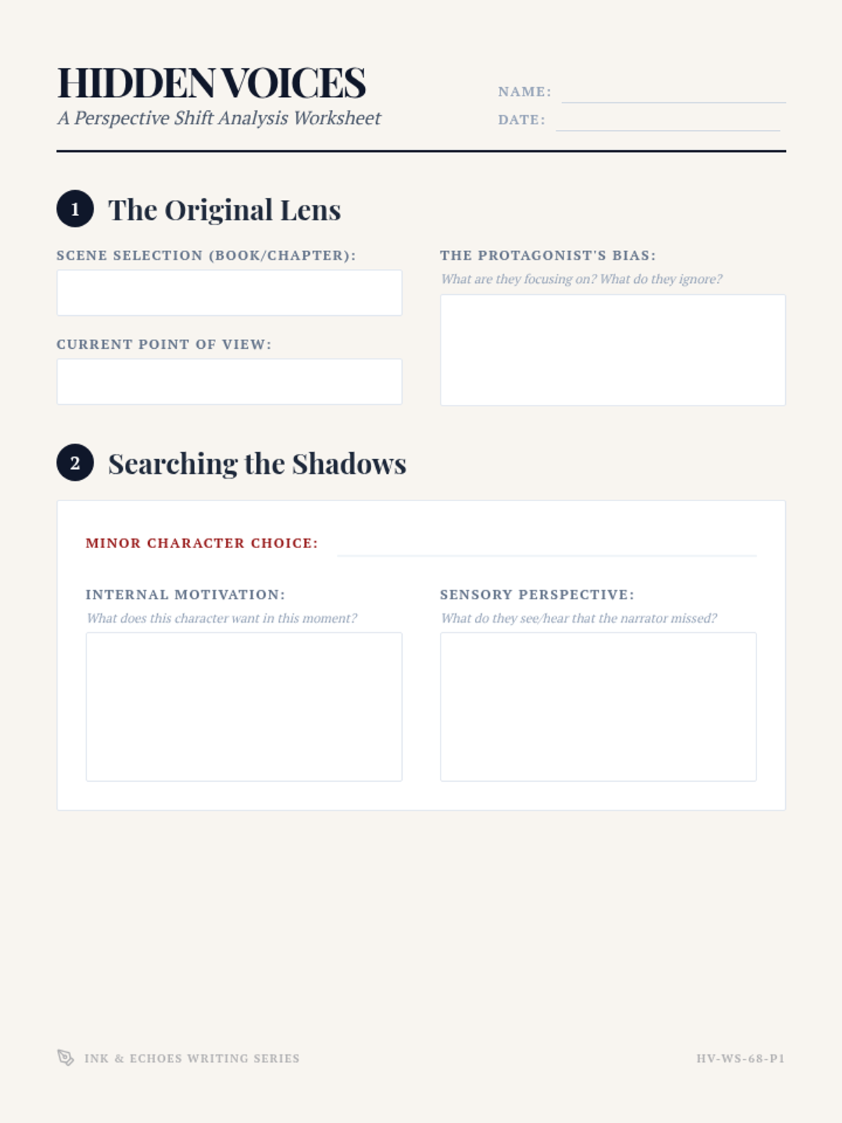 A guided worksheet for middle school students to analyze a primary character's bias and draft a scene rewrite from a minor character's perspective, featuring sensory and motivational prompts.