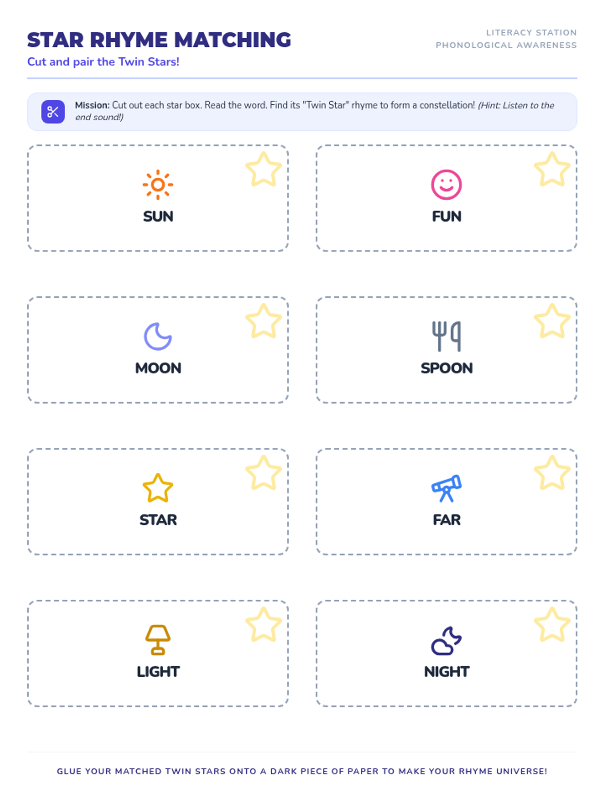 A printable card-matching activity where students pair 'Twin Star' cards featuring rhyming words like Sun/Fun and Moon/Spoon to practice phonological awareness.