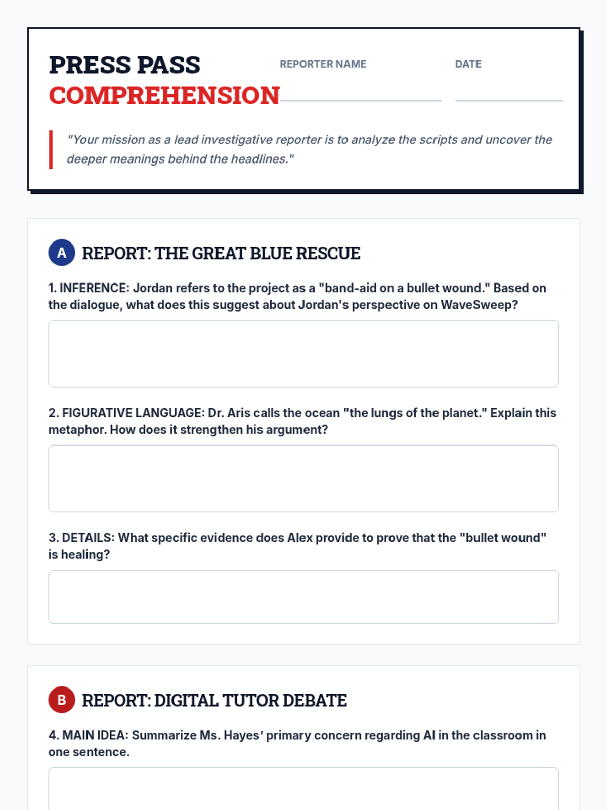 A high-engagement comprehension worksheet designed as a "Press Pass" report. Revised to ensure correct page breaks, white background student work areas, and better readability.