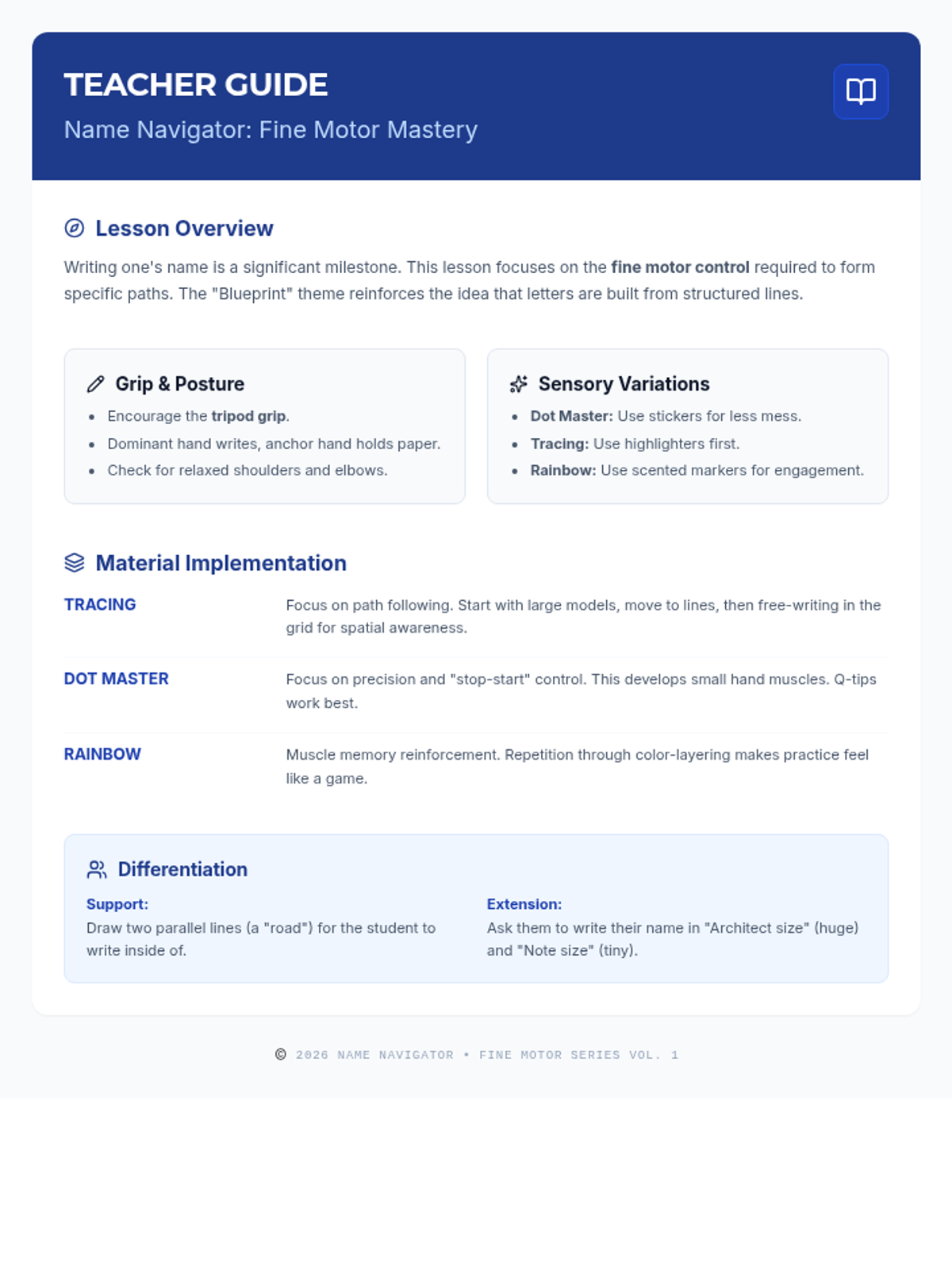 A comprehensive teacher guide for the Name Navigator lesson, featuring instructional strategies for grip, sensory variations, and differentiation tips. Revised to fit onto a single page.
