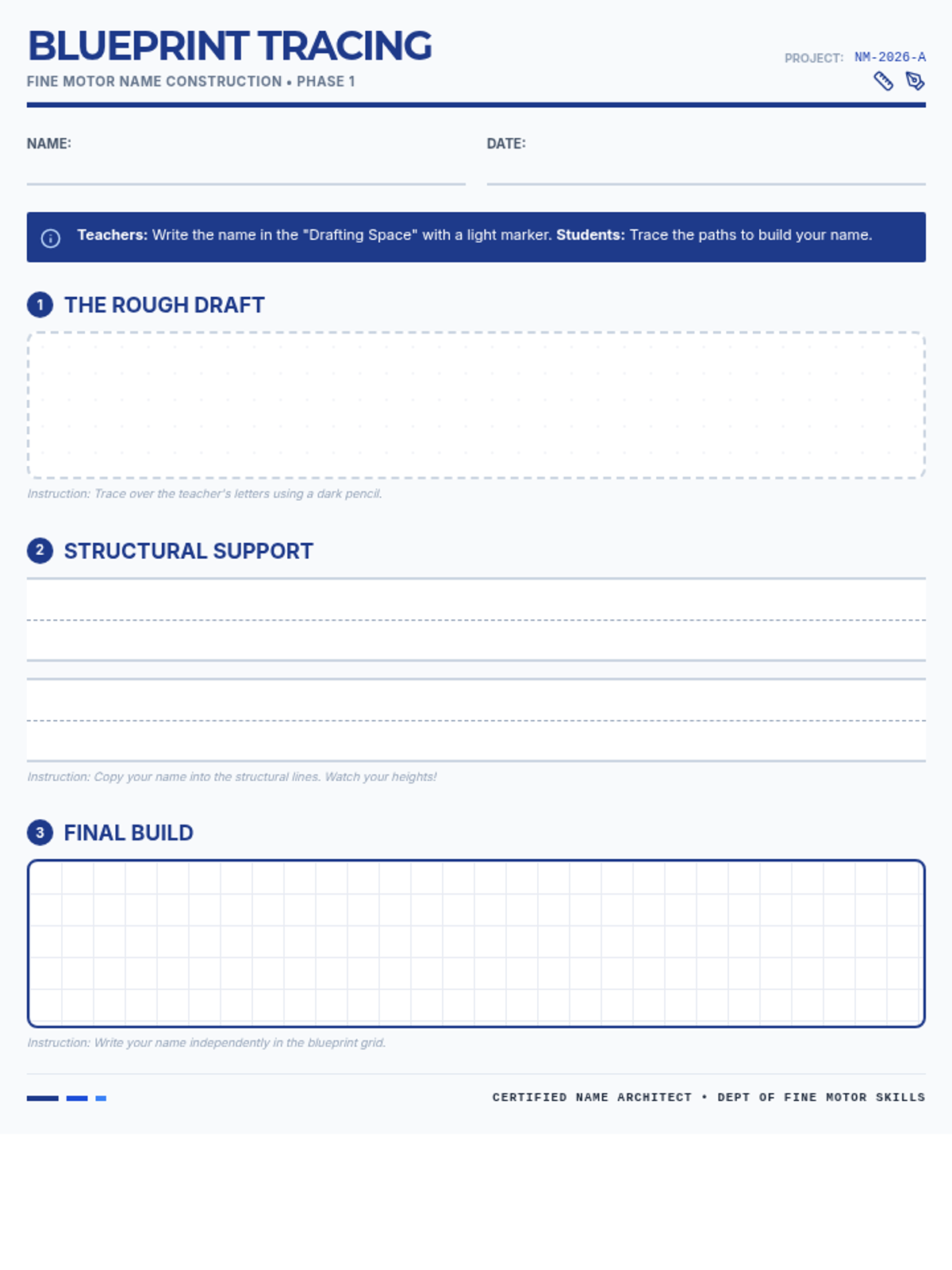 A blueprint-themed worksheet for name tracing and structural writing practice. Includes designated areas for teacher-assisted drafting, guided lines, and independent grid-based writing. Revised for single-page fit, improved midline contrast, and cleaner work areas.