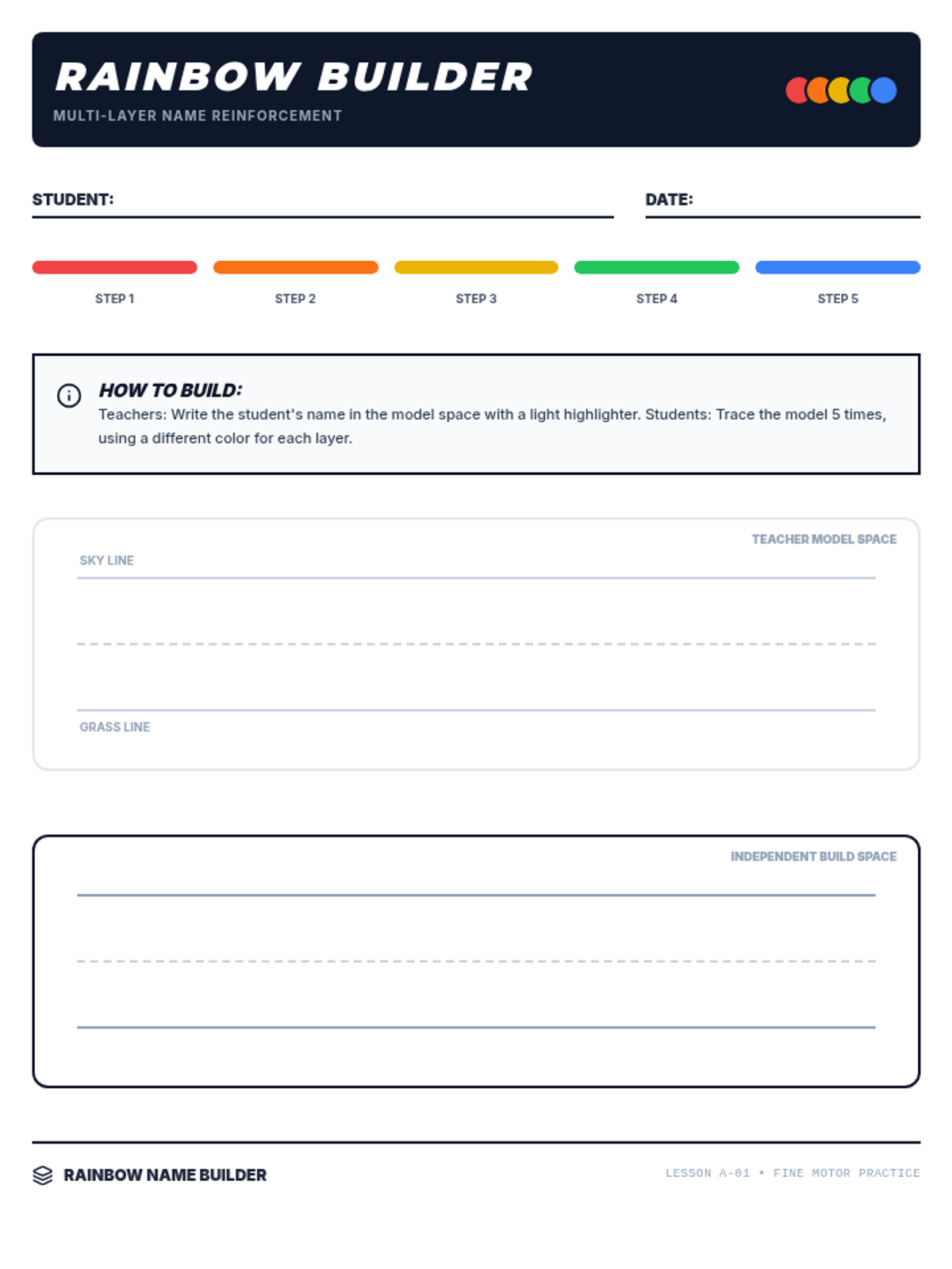 A vibrant rainbow writing worksheet designed to improve muscle memory through repetitive tracing. Features a teacher-led model space and an independent build space with full primary handwriting lines. Revised for age-appropriate terminology, white work area background, and single-page formatting.