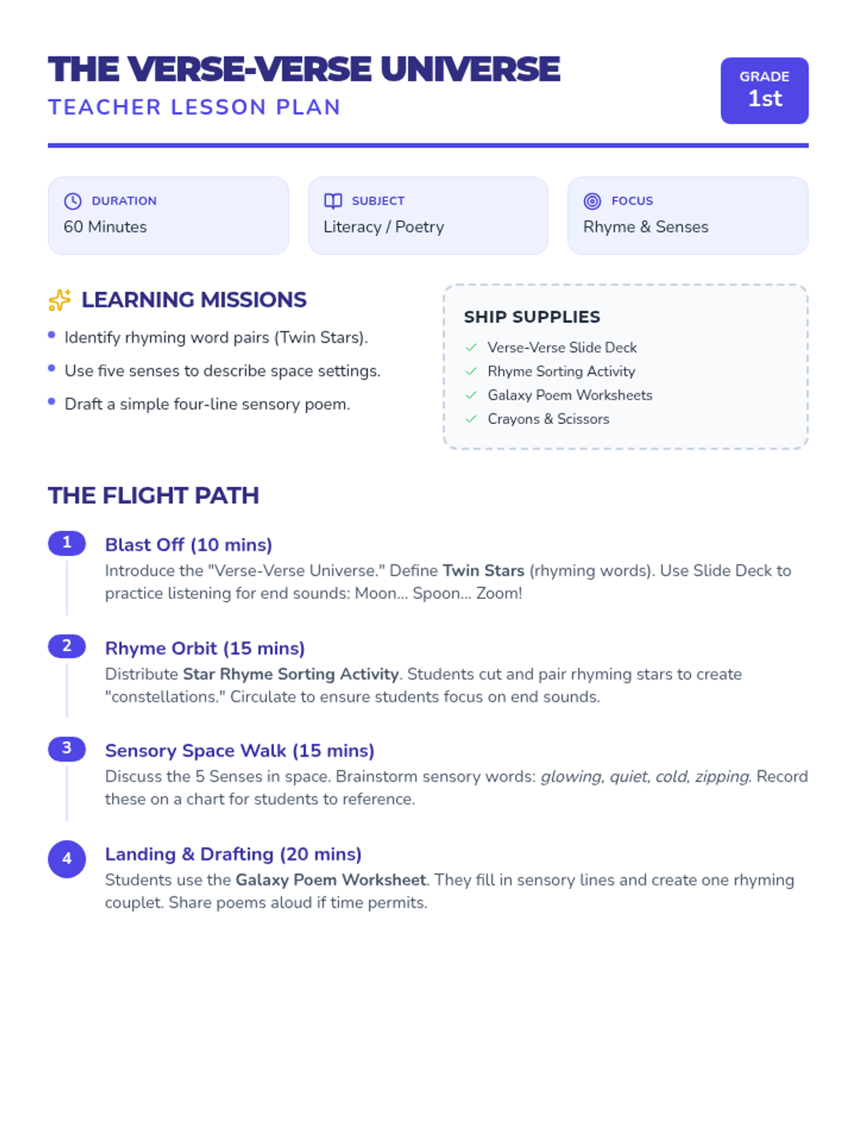 A comprehensive teacher's guide for 'The Verse-Verse Universe' lesson, including learning objectives, a detailed instructional sequence, and differentiation strategies for 1st-grade poetry instruction.
