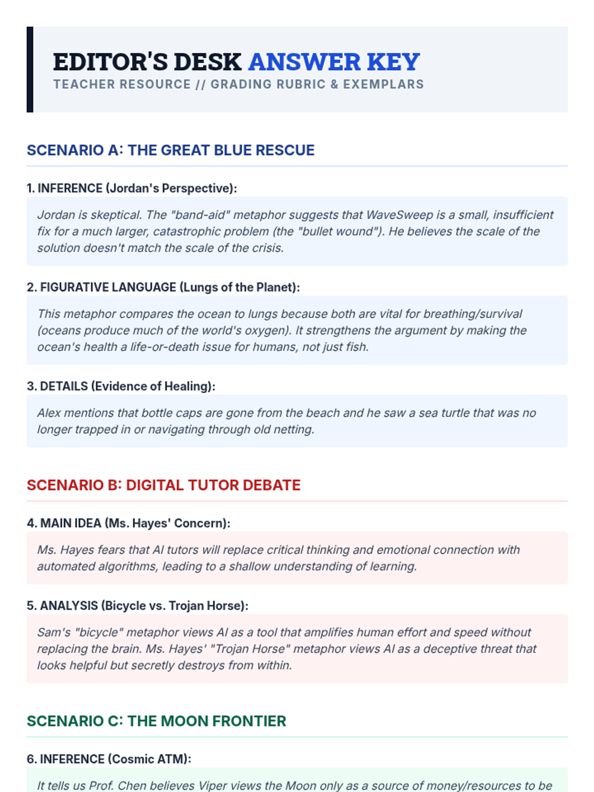 Answer key and rubric for Headline Heroes. Revised with 'break-inside-avoid' to keep questions and answers together and improved text contrast.