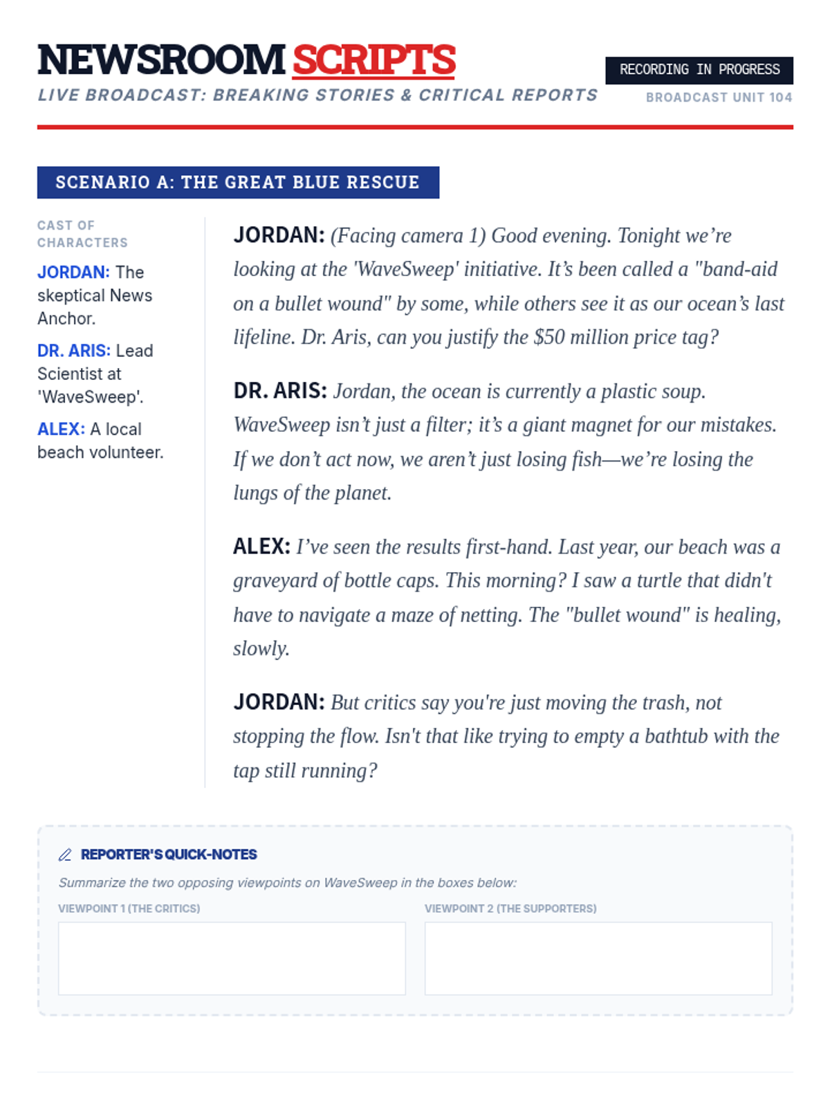 Three newsroom-style role-play scripts covering environmental issues, AI in education, and space exploration, designed to facilitate comprehension through performance. Revised with corrected typos, improved page spacing, and integrated quick-notes for students.