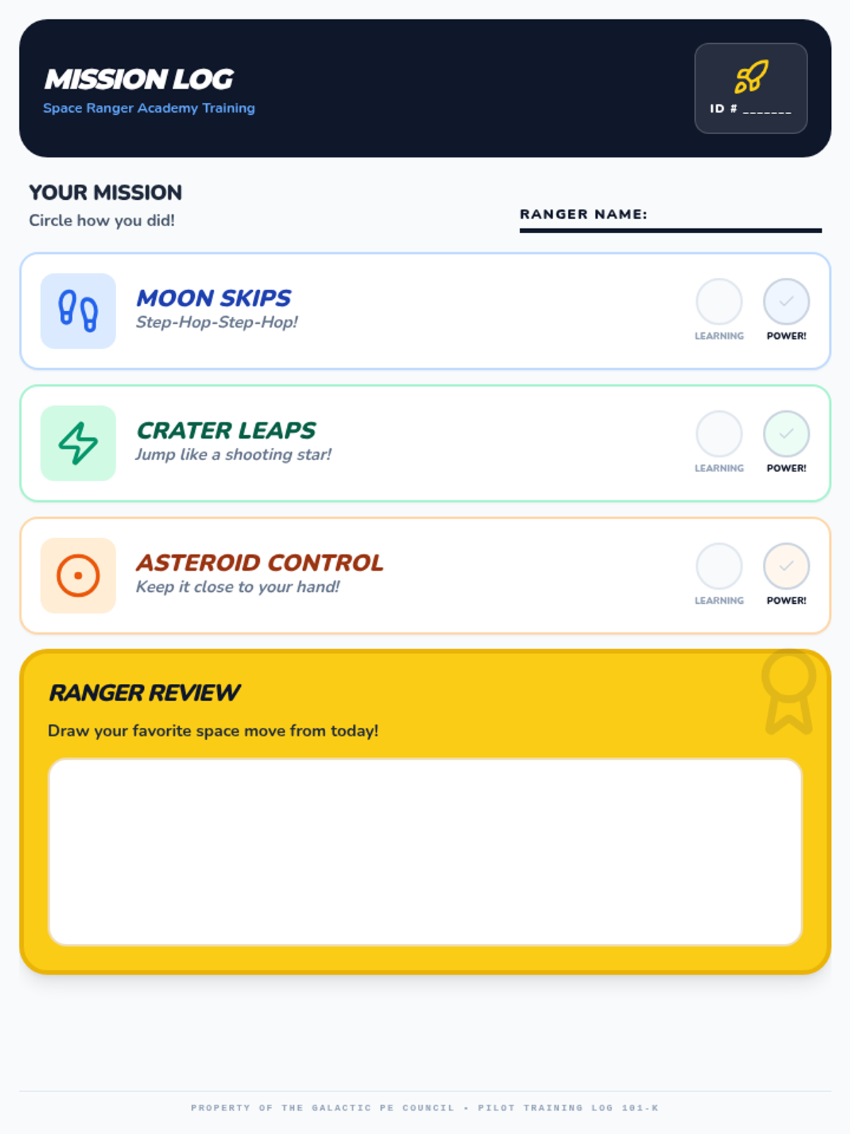 A student-facing mission log for self-assessment. It features large icons for skipping, leaping, and dribbling, and a space for students to draw their favorite activity. Perfect for tactile feedback at the end of the lesson.