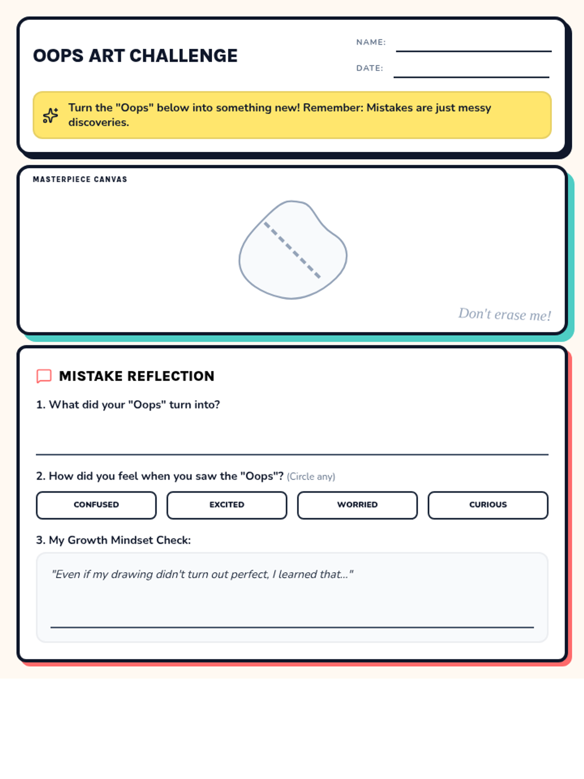 A creative student worksheet for the 'Oops Art Challenge.' Students start with a pre-printed 'mistake' (squiggle or smudge) and must transform it into a masterpiece, followed by a short reflection on their growth mindset.