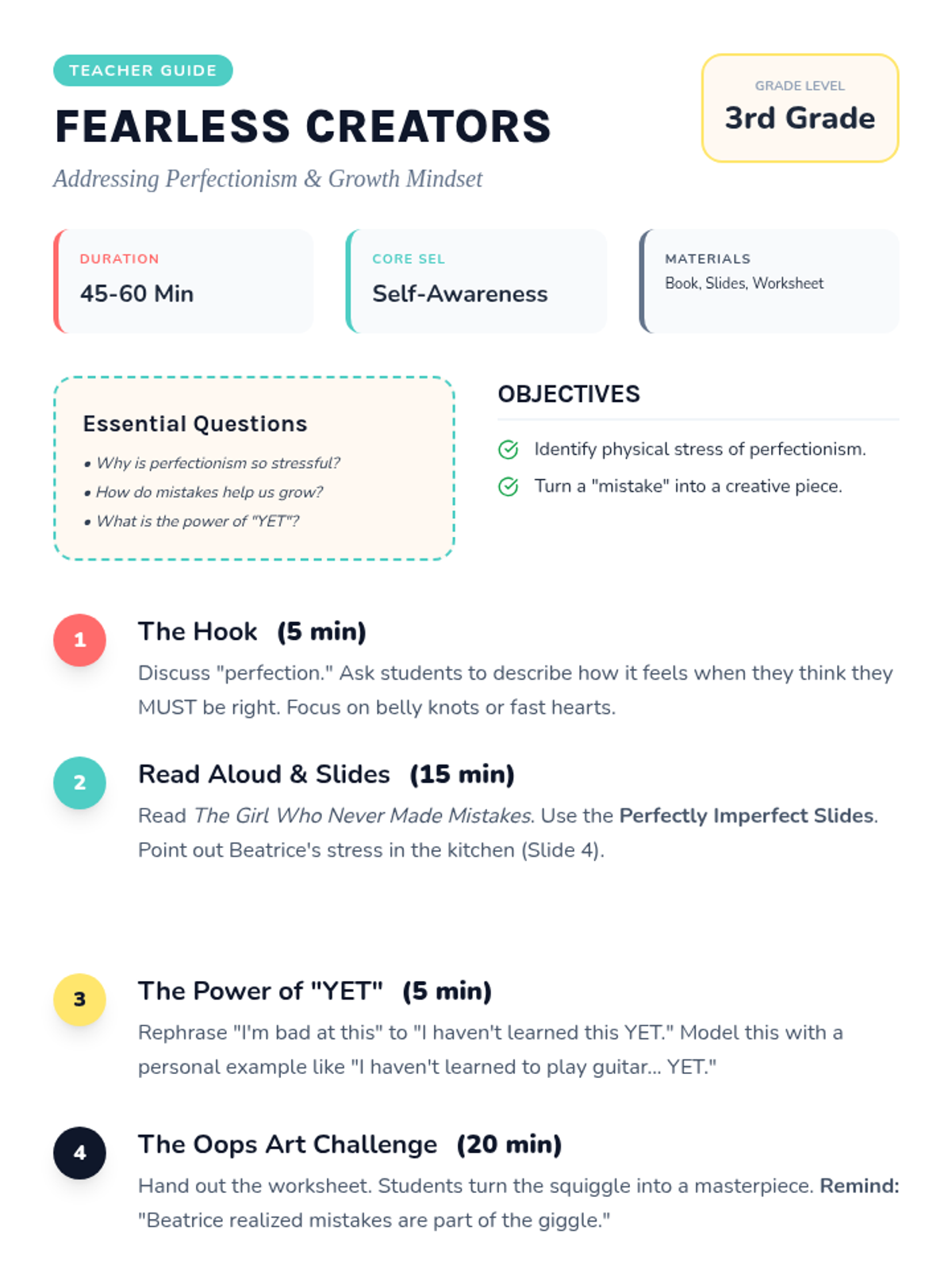 A comprehensive facilitation guide for teachers to deliver the 'Mistake Masterpiece' lesson. Includes time breakdowns, discussion prompts, instructional steps, and tips for addressing perfectionism in 3rd-grade students.