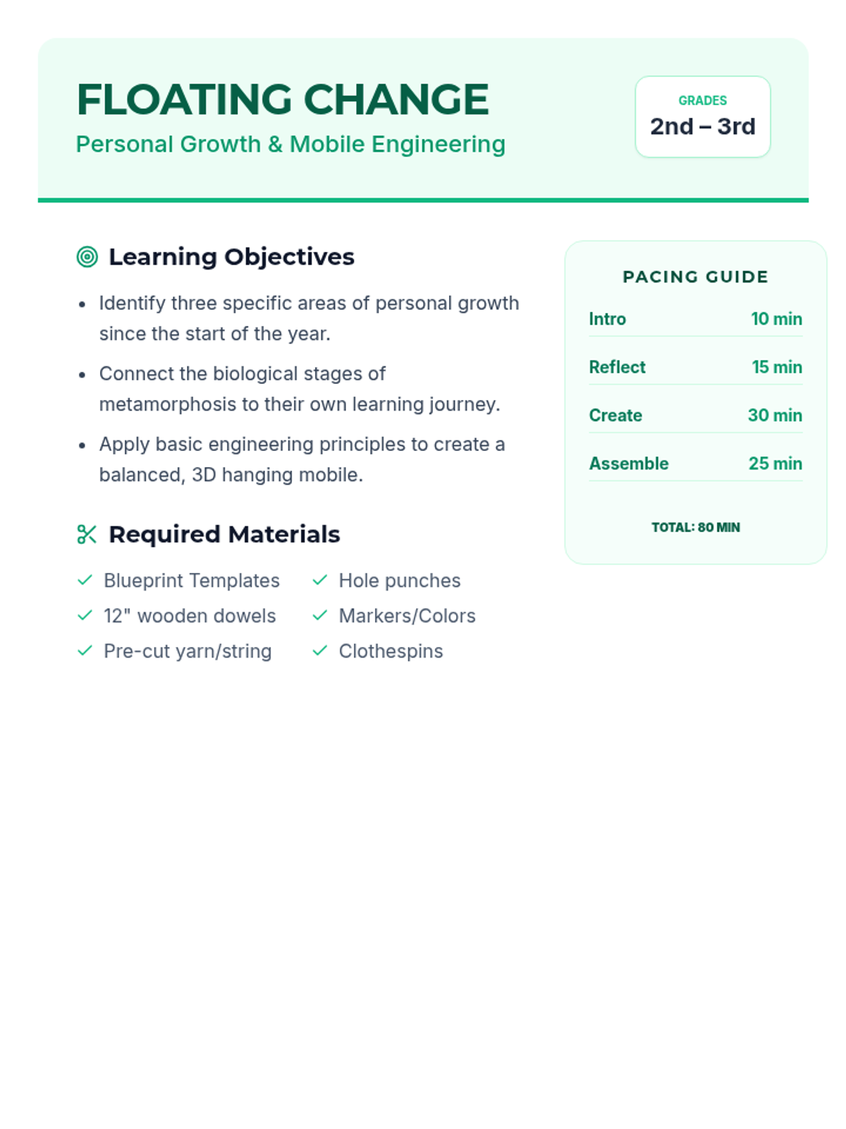 An engaging slide deck that introduces students to the biological stages of metamorphosis and connects them to personal learning journeys. Includes interactive prompts for brainstorming growth and a step-by-step guide for engineering the balanced 3D butterfly mobile.
