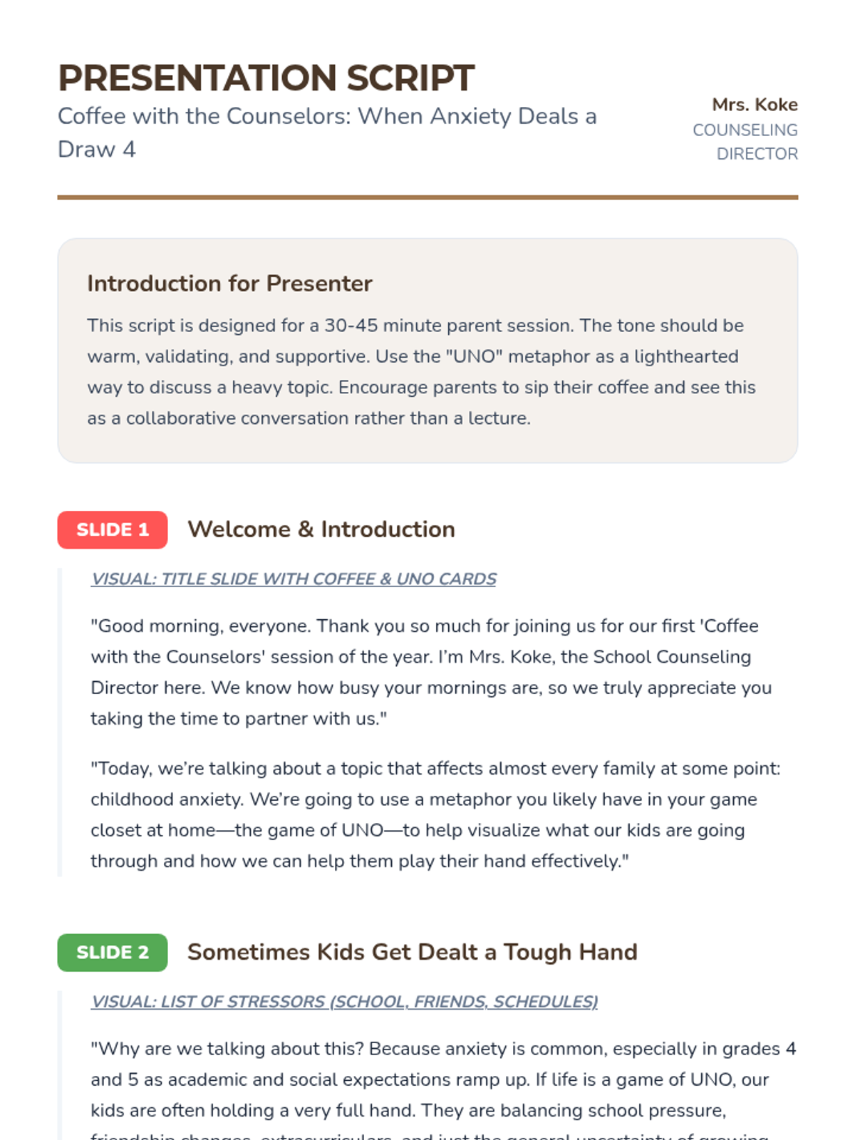 A comprehensive presenter script for the 'Coffee with the Counselors' parent session. It provides slide-by-slide talking points, visual cues, and transition phrases, maintaining a warm and collaborative tone for the school counselor to use during the presentation.