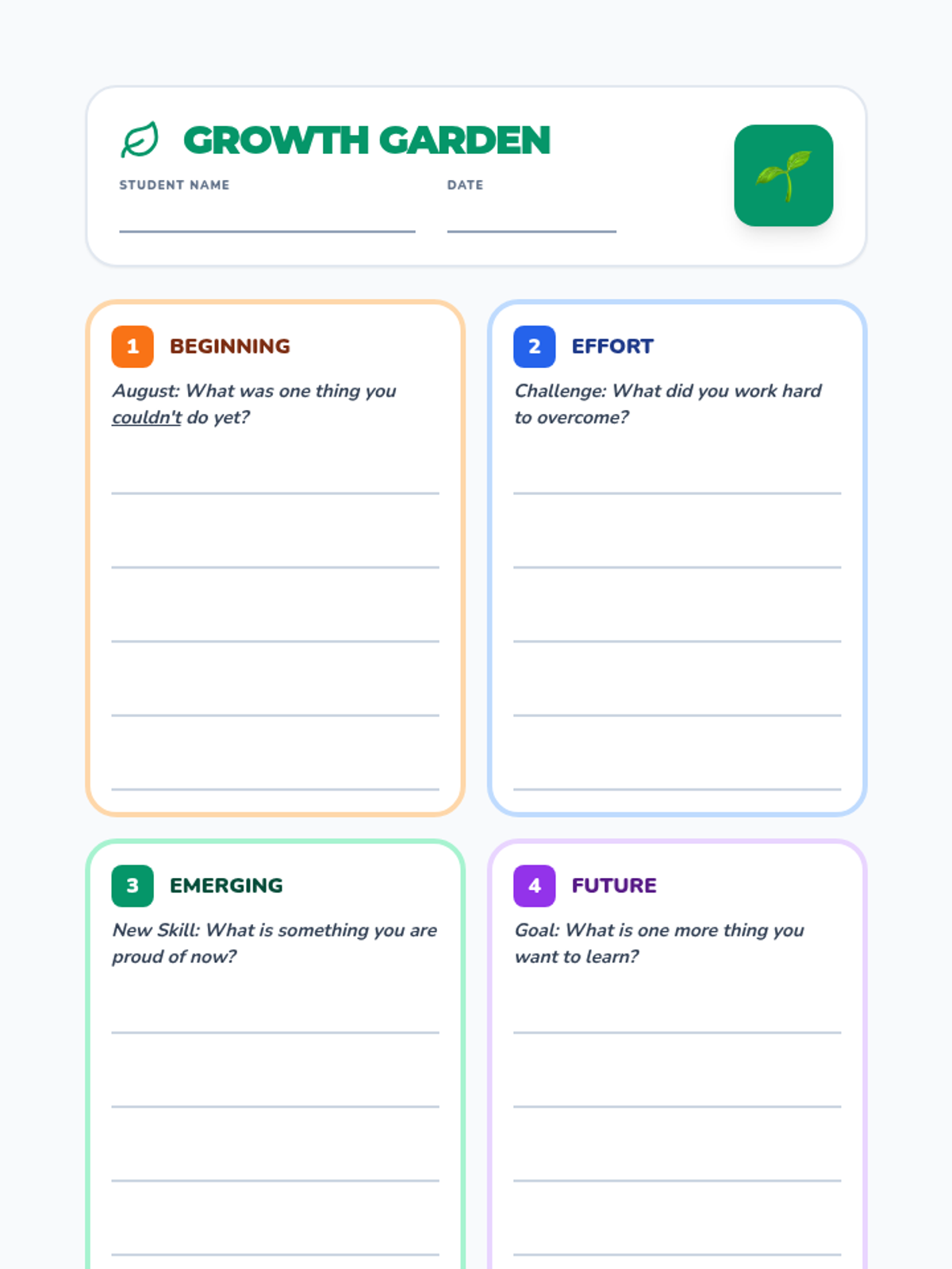 A reflective student worksheet designed for brainstorming personal growth milestones. It uses the four stages of metamorphosis to guide 2nd and 3rd graders through identifying their beginning-of-year struggles, current achievements, and future goals.