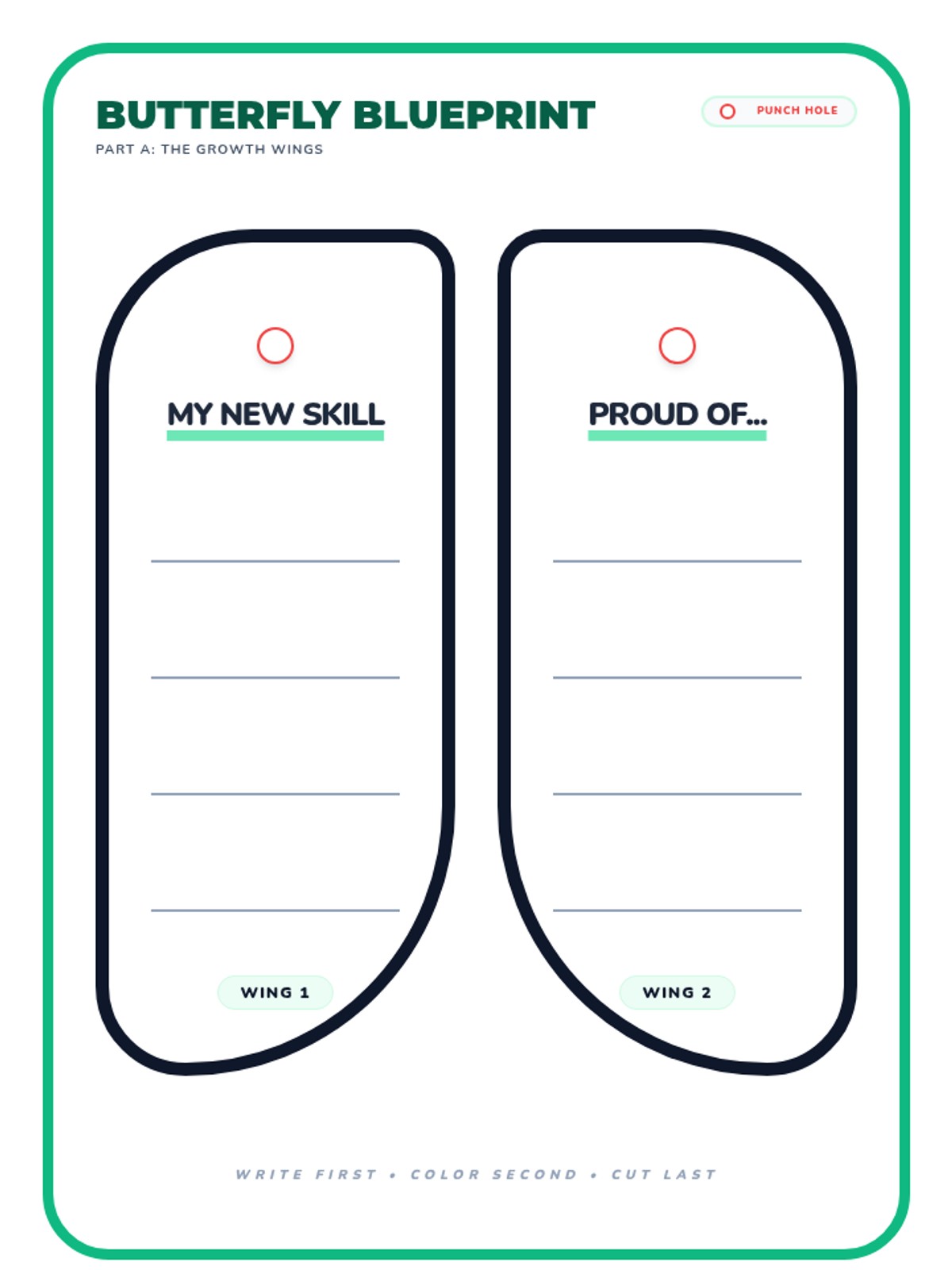 A printable project template for creating the 3D butterfly mobile. Includes bold outlines for butterfly wings, the body, and life cycle components (caterpillar and chrysalis) with integrated writing prompts and hole-punch guides for engineering the final hanging mobile.