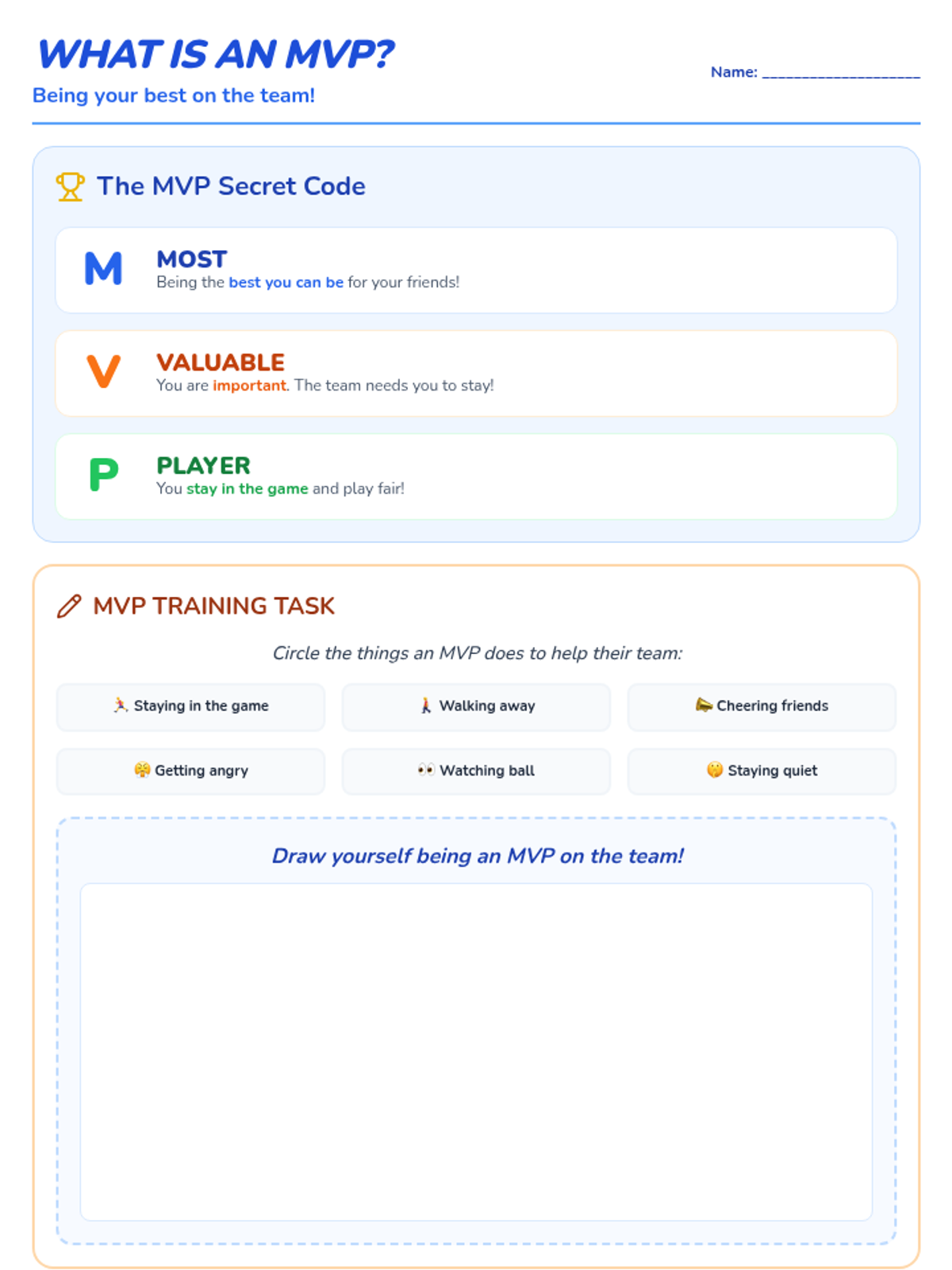 A printable student task that explains the MVP acronym in a child-friendly way and includes a trait-selection activity and drawing space. Tightened to ensure single-page fit and improved drawing space.