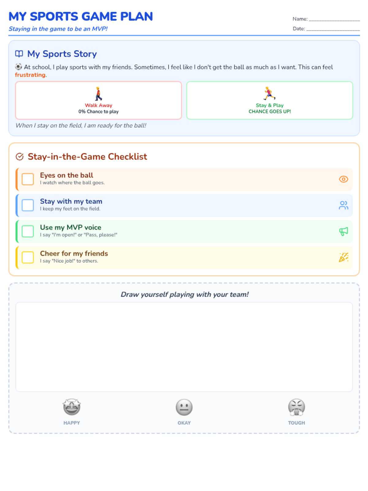 A visual checklist and social story combined on a single page, designed for a Year 2 boy to manage frustration and encourage participation in sports. Tightened to ensure single-page fit and increased drawing space.