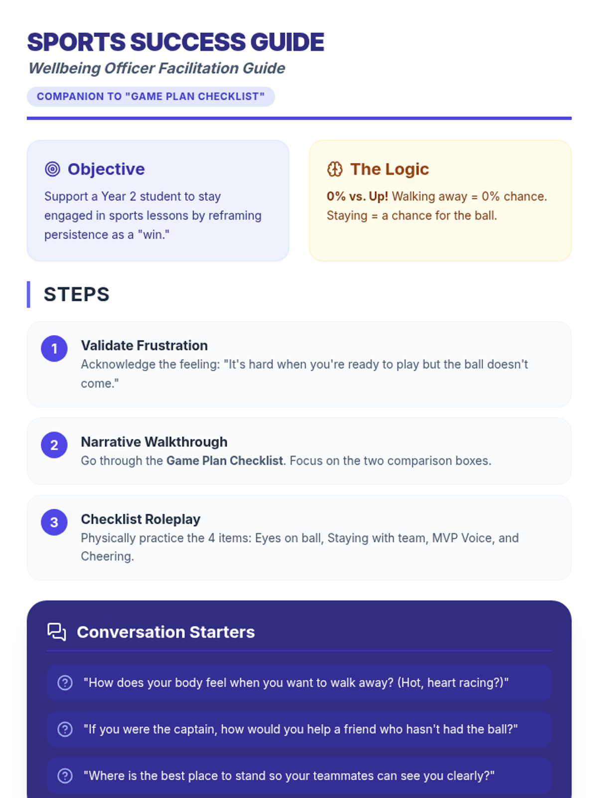 A facilitation guide for the Wellbeing Officer. Condensed to ensure a single-page fit. Increased font sizes and improved layout for better professional use.