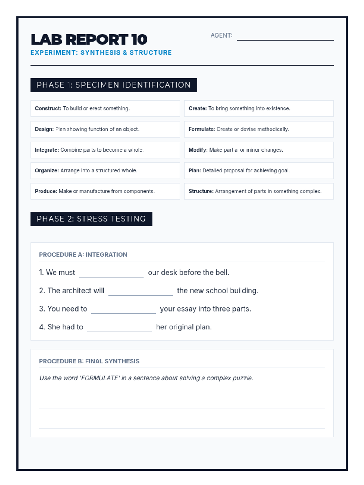 Revised student practice worksheet for Synthesis & Structure vocabulary. Standardized header, expanded practice, and improved layout.