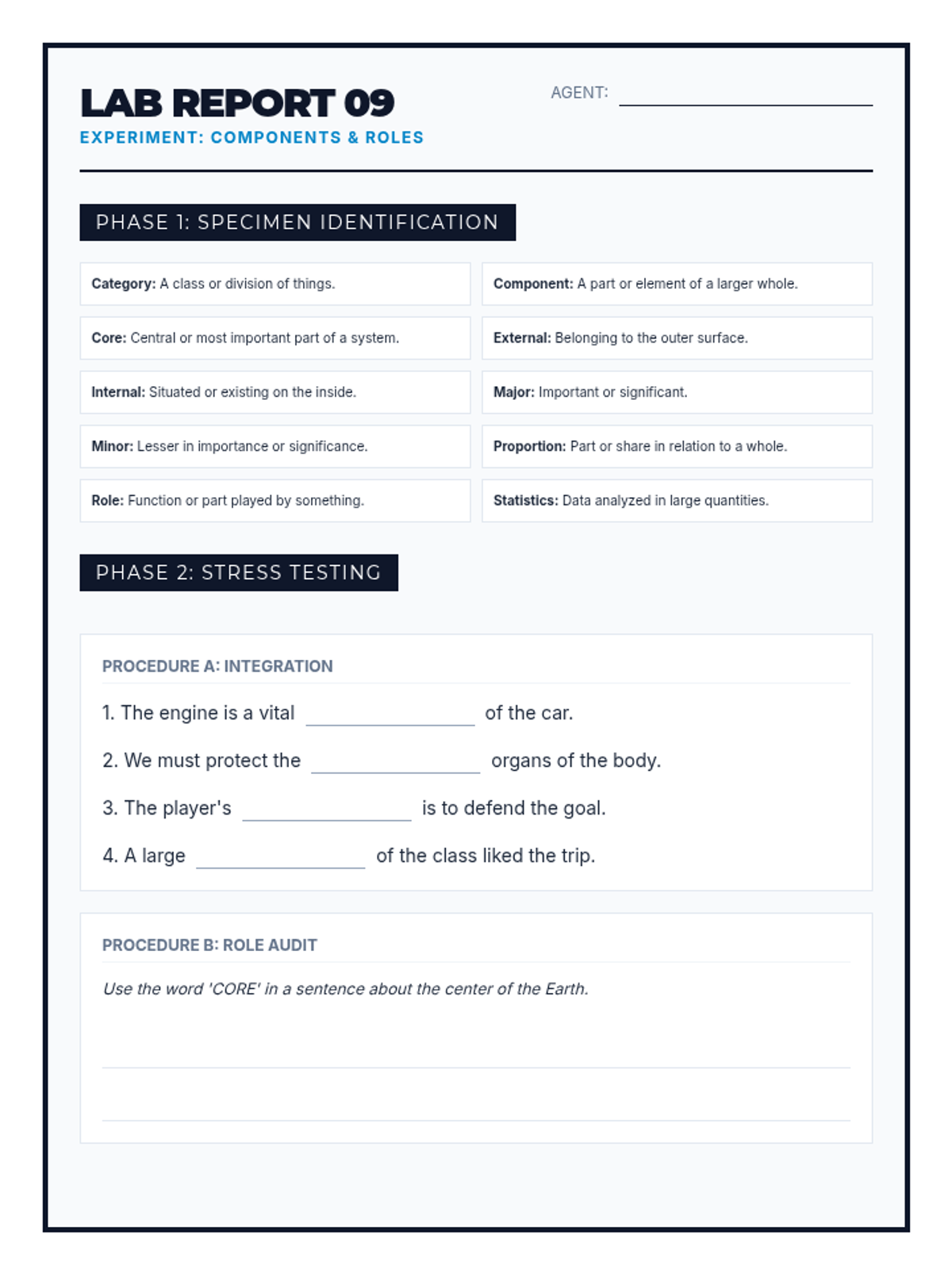 Revised student practice worksheet for Components & Roles vocabulary. Standardized header, expanded practice, and improved layout. Added accurate academic definitions for 'Core' and 'Role'.
