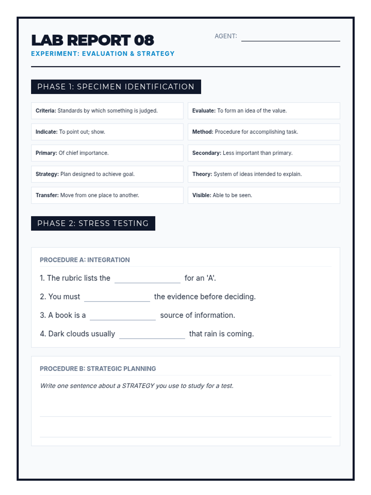 Revised student practice worksheet for Evaluation & Strategy vocabulary. Standardized header, expanded practice, and improved layout.