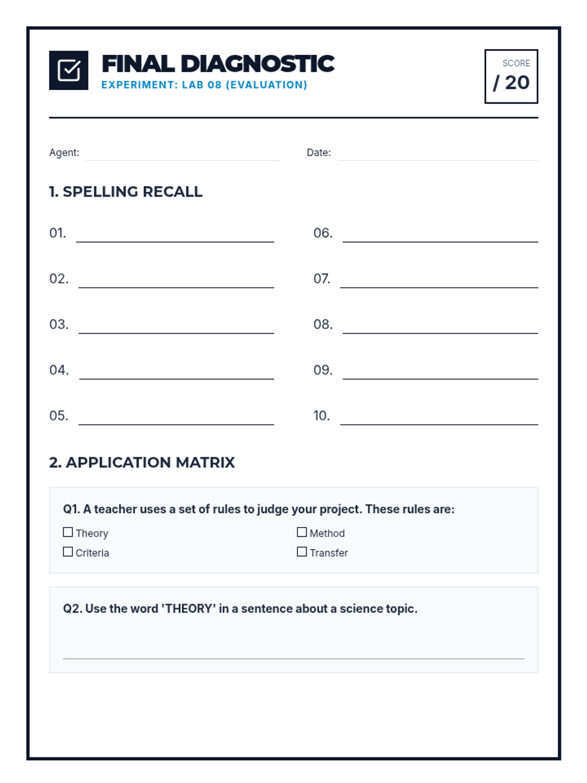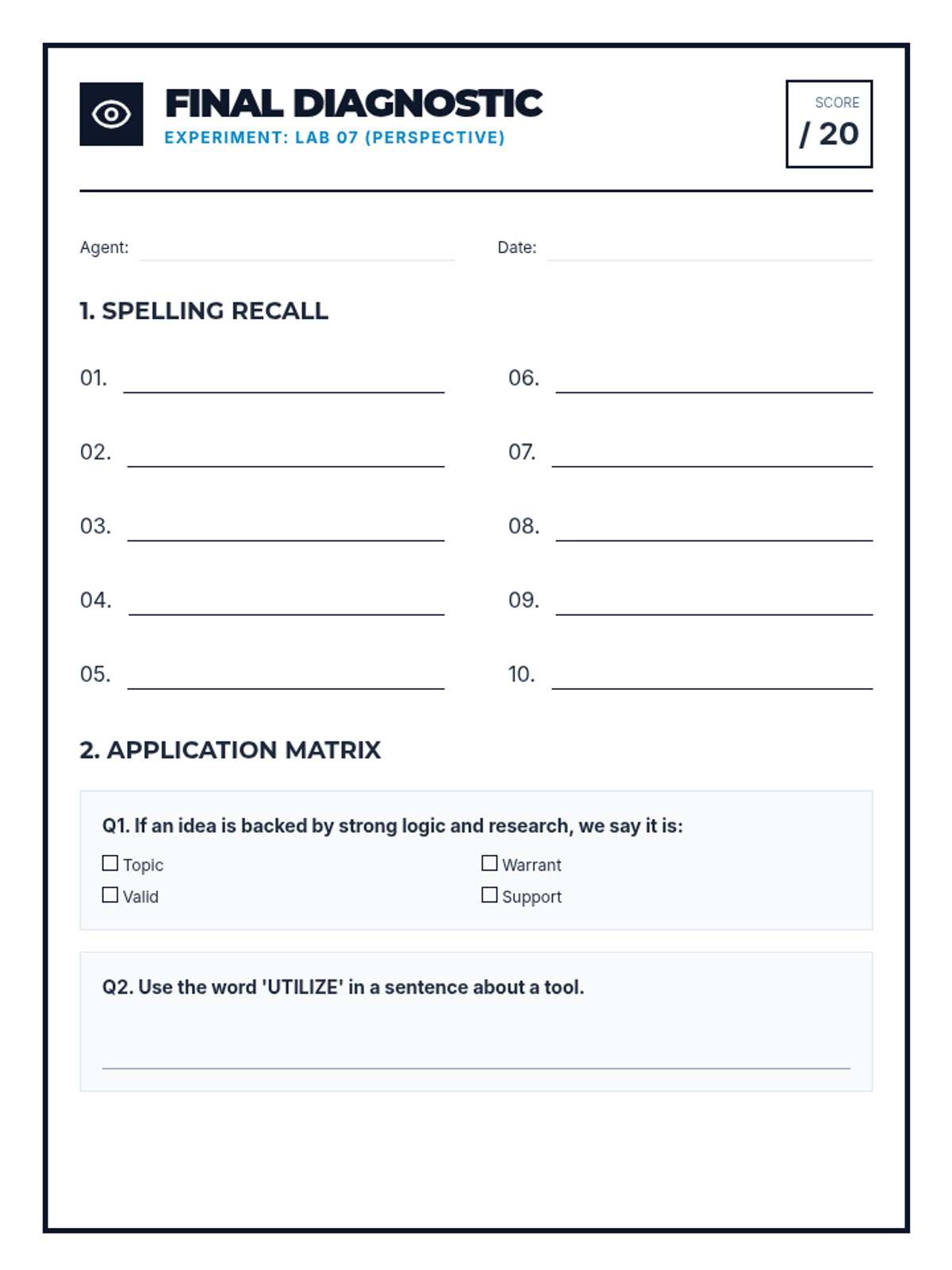 Revised diagnostic test for Evaluation & Strategy vocabulary. Standardized numbering to 1-10, added student identifiers, and expanded practice content.