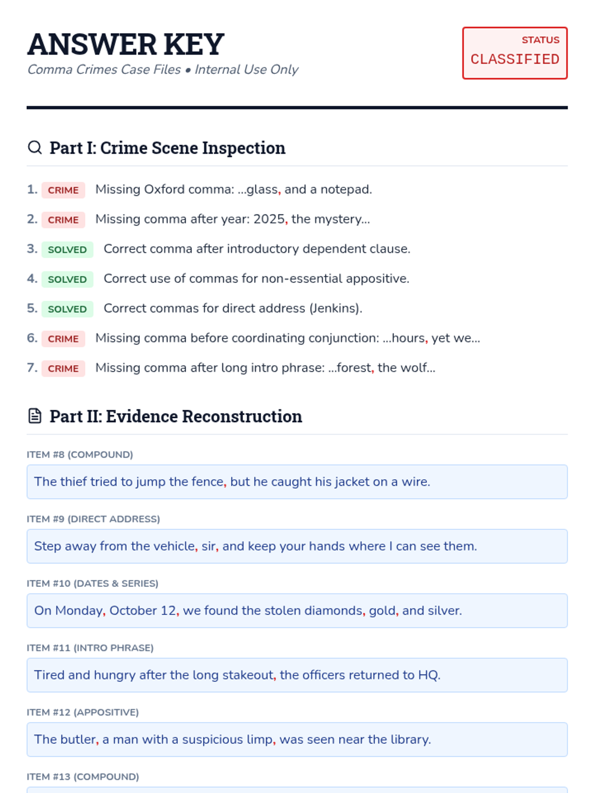A comprehensive answer key for the Comma Crimes Worksheet, providing classified-themed answers, detailed explanations for corrections, and a suggested grading breakdown.