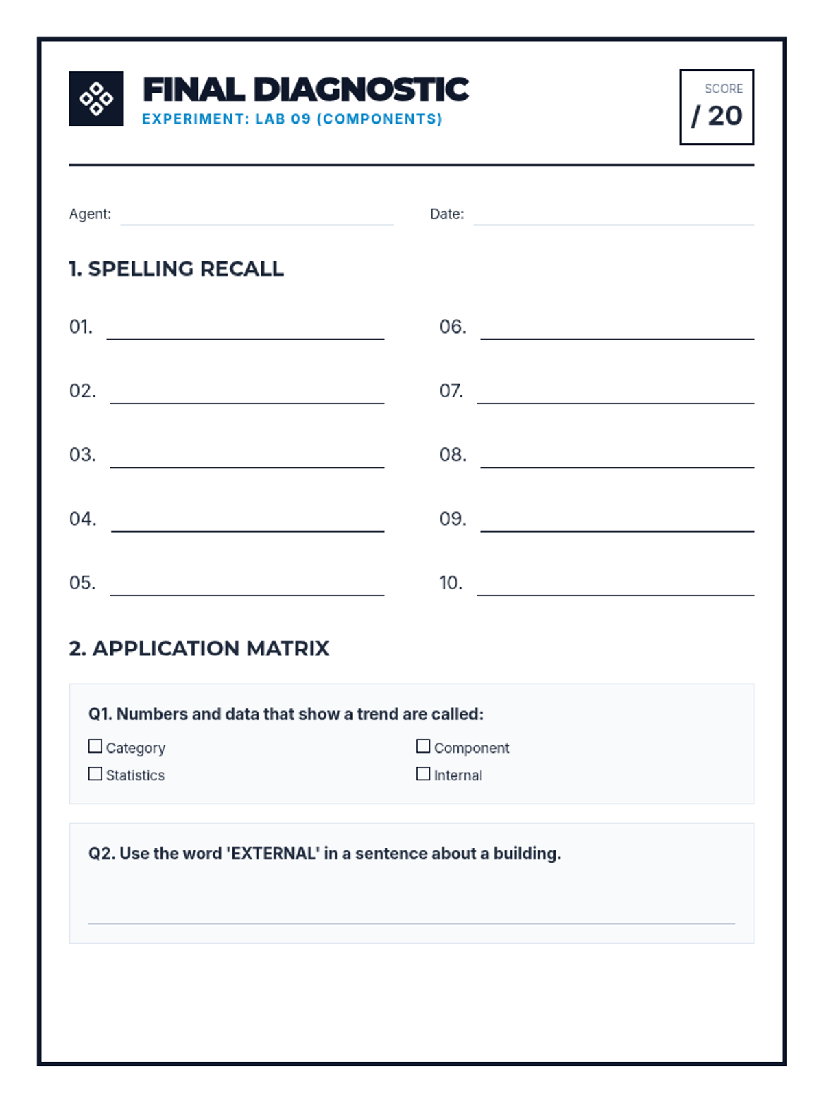 Revised diagnostic test for Components & Roles vocabulary. Standardized numbering to 1-10, added student identifiers, and expanded practice content.