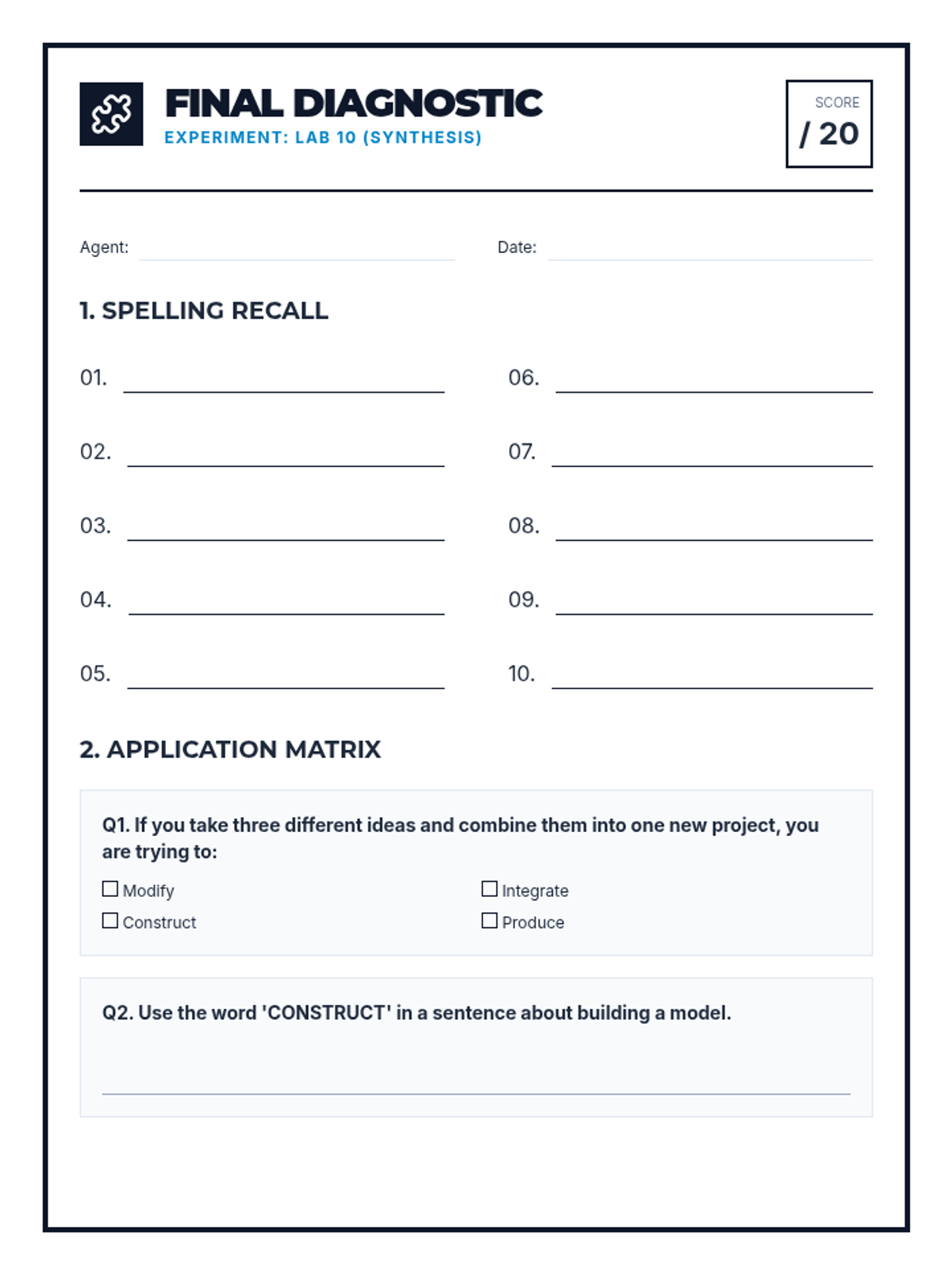 Revised diagnostic test for Synthesis & Structure vocabulary. Standardized numbering to 1-10, added student identifiers, and expanded practice content.