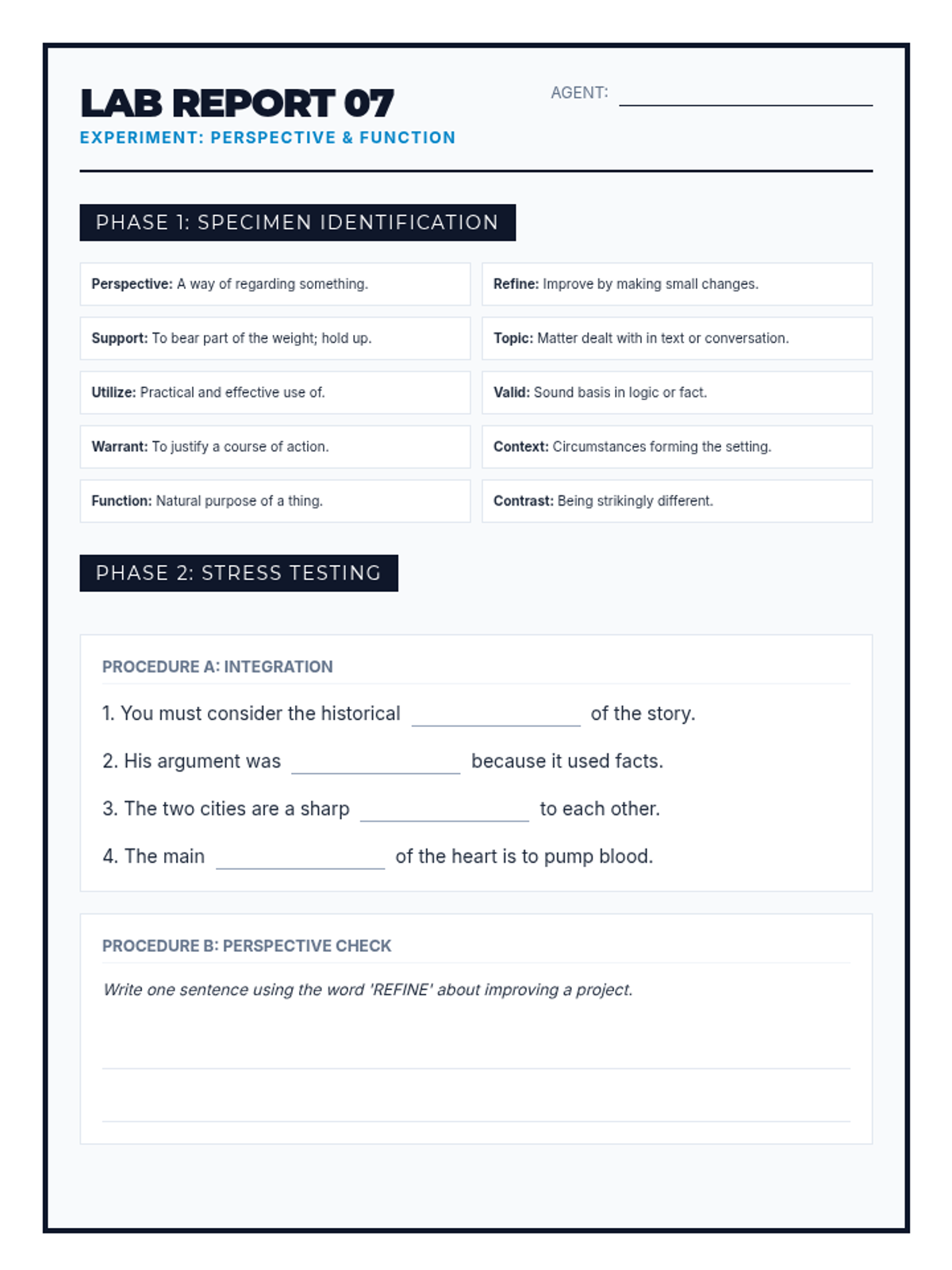 Revised student practice worksheet for Perspective & Function vocabulary. Standardized header, expanded practice, and improved layout.
