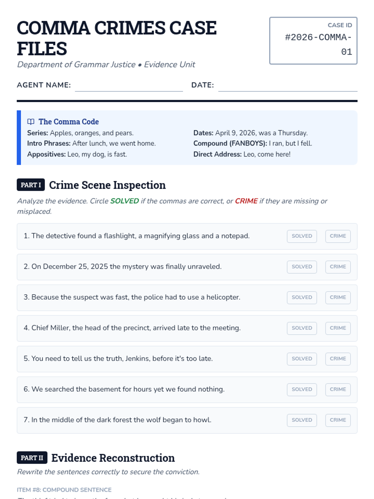 A comma review worksheet featuring 15 questions divided into identification and rewriting tasks, themed around a detective agency case file. Includes coverage for items in a series, dates, introductory elements, compound sentences, and appositives.