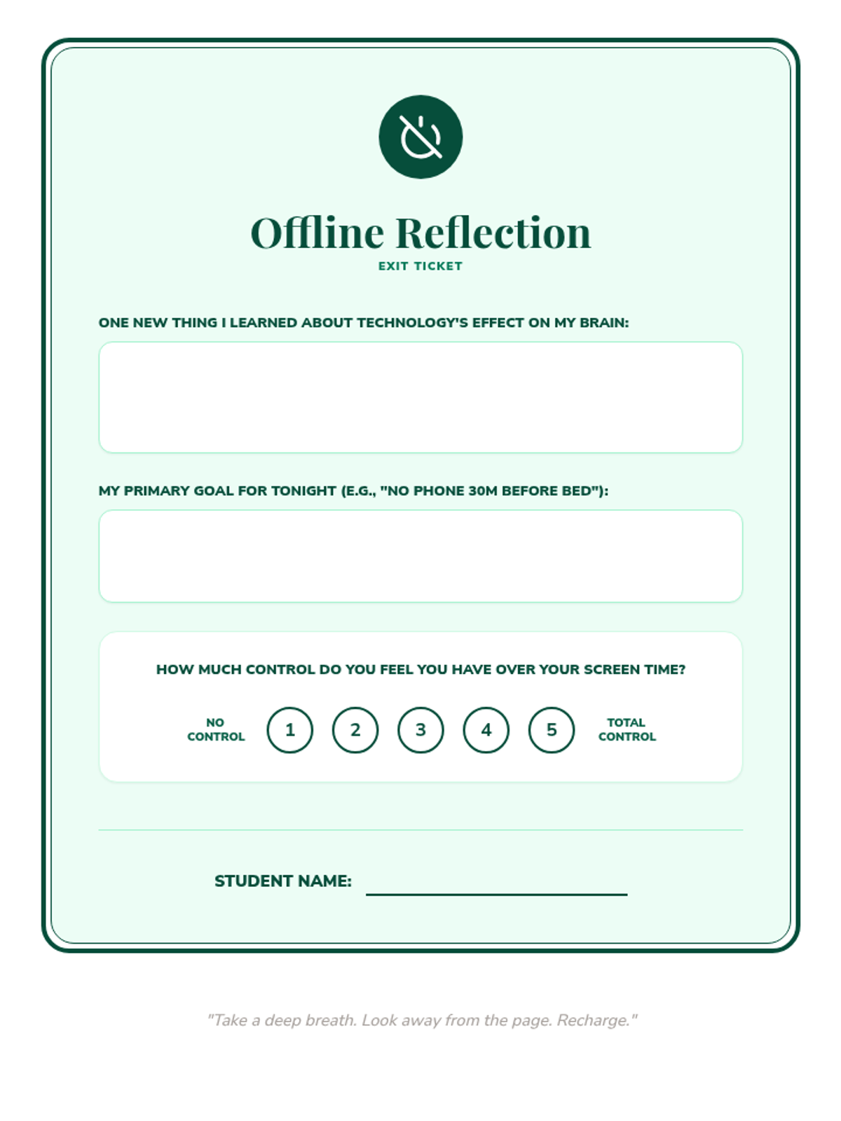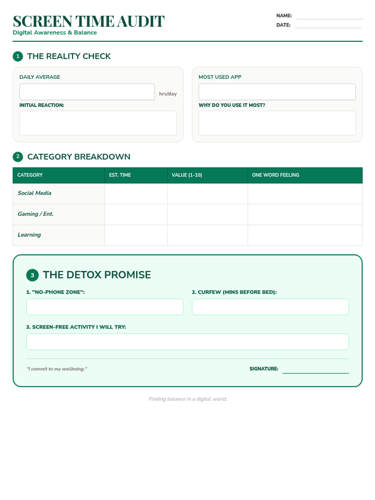 A structured worksheet for students to audit their current screen time habits and commit to specific, manageable goals for a digital detox.