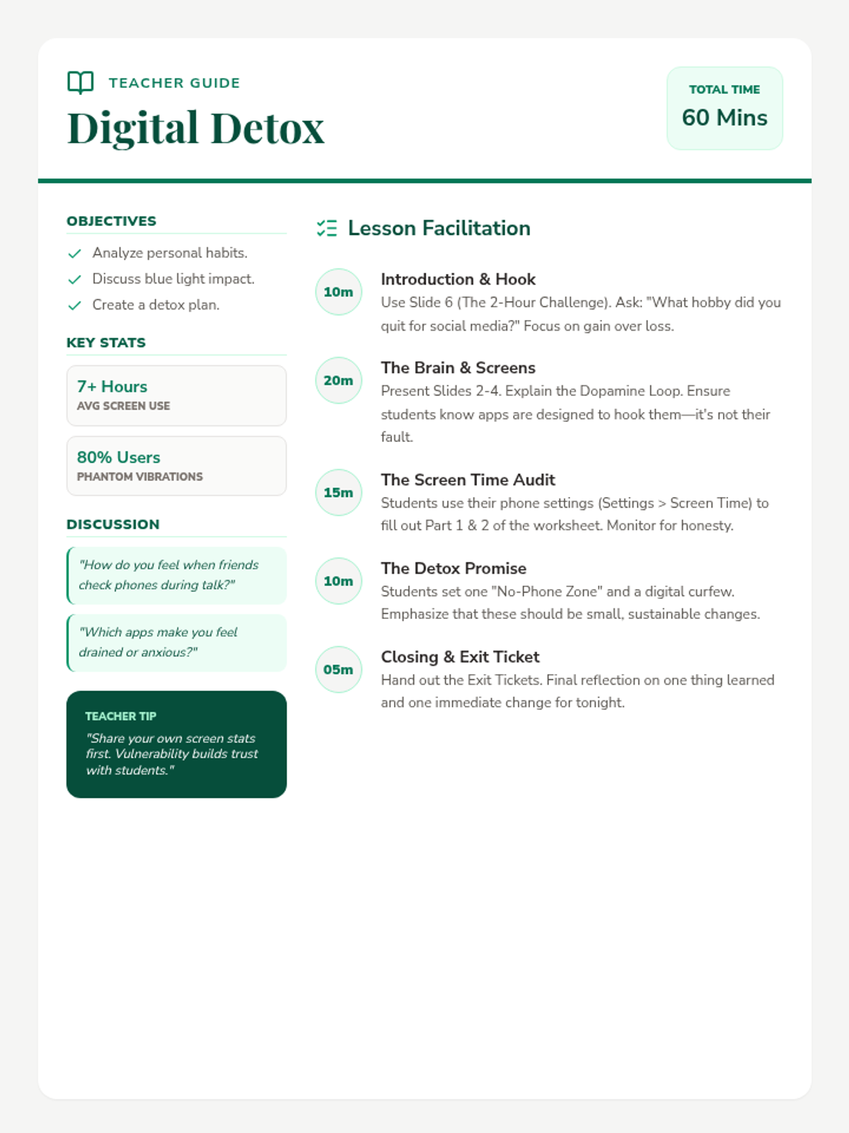 A comprehensive guide for teachers to facilitate the Digital Detox lesson, including pacing, background statistics, and discussion prompts.
