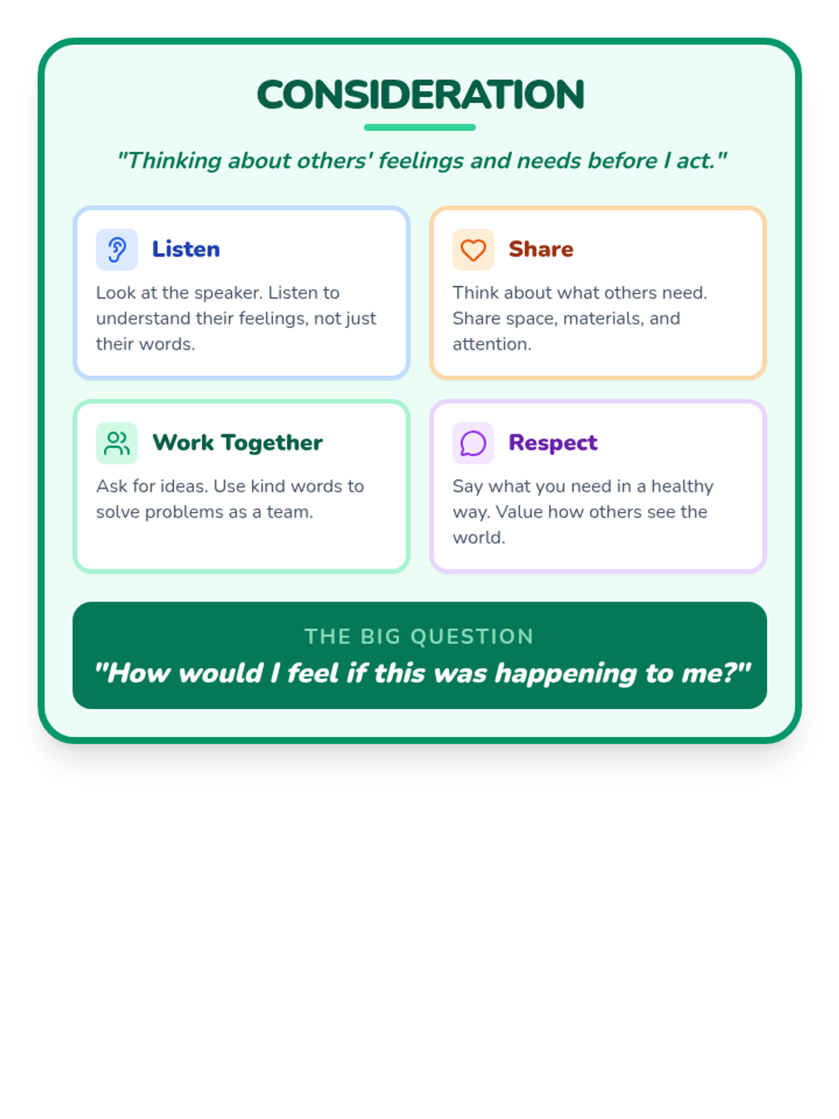 A visual mini-anchor chart for students to keep in their folders or for classroom display, defining the key components of consideration. Revised to fit on a single page.